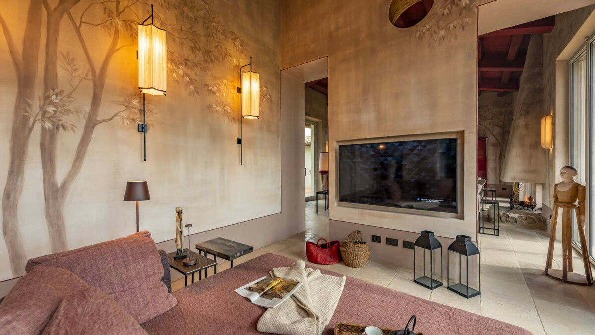 Les espaces intérieurs se distinguent par leur atmosphère élégante et authentique. Le salon principal, spacieux et baigné de lumière, est coiffé d’un plafond cathédrale en bois et s’ouvre, grâce à de larges baies vitrées, sur le jardin et la terrasse. Les murs, aux finitions raffinées et ornés de décors peints subtils, sous-tendent une esthétique à la fois artistique et sobre. La salle à manger attenante et la cuisine entièrement équipée répondent à toutes les exigences, qu’il s’agisse de repas conviviaux ou d’expériences culinaires plus élaborées. Chaque pièce est pensée pour allier confort, intimité et convivialité, dans un esprit résolument apaisant.