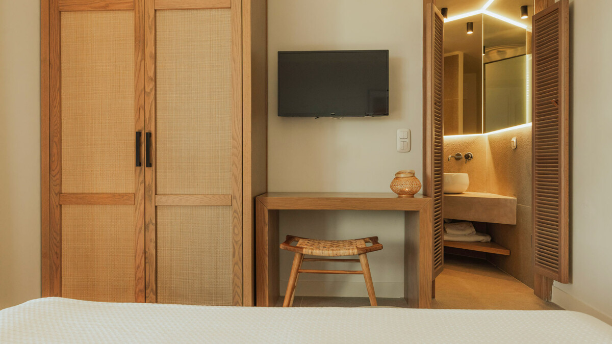 Chambre, Rez-de-chaussée, vue piscine. La chambre propose 1 lit double 160 cm. Salle de bain privée, avec douche. WC dans la salle de bain. La chambre inclut également : climatisation, coffre fort, balcon.