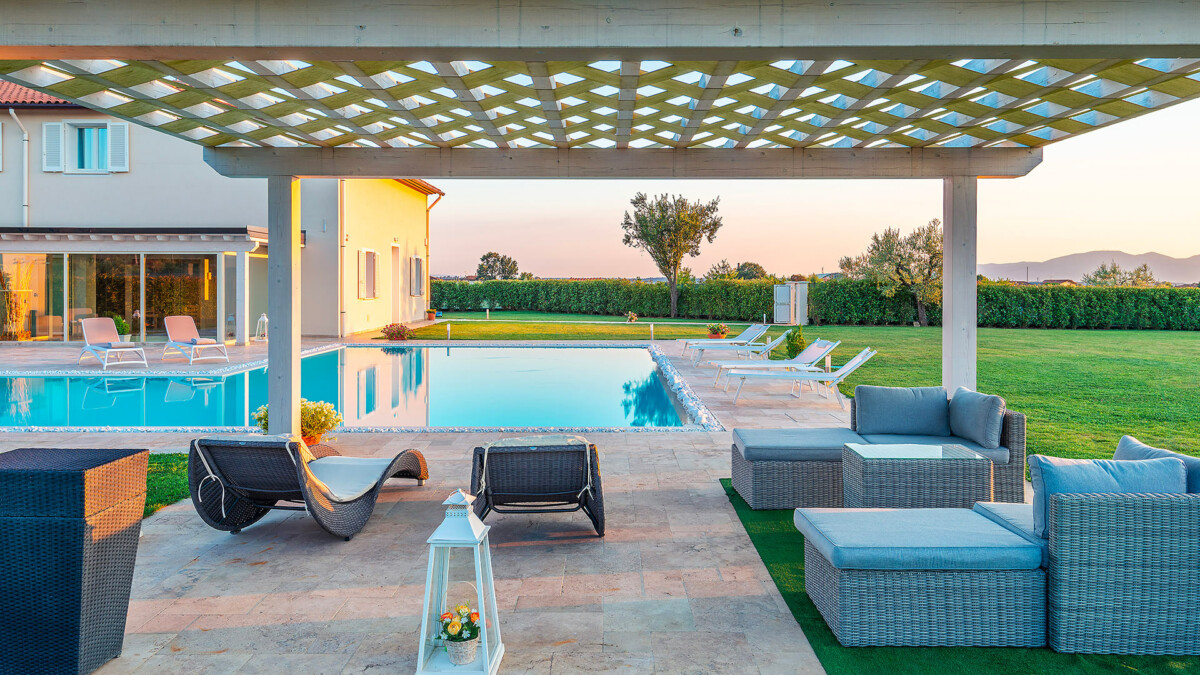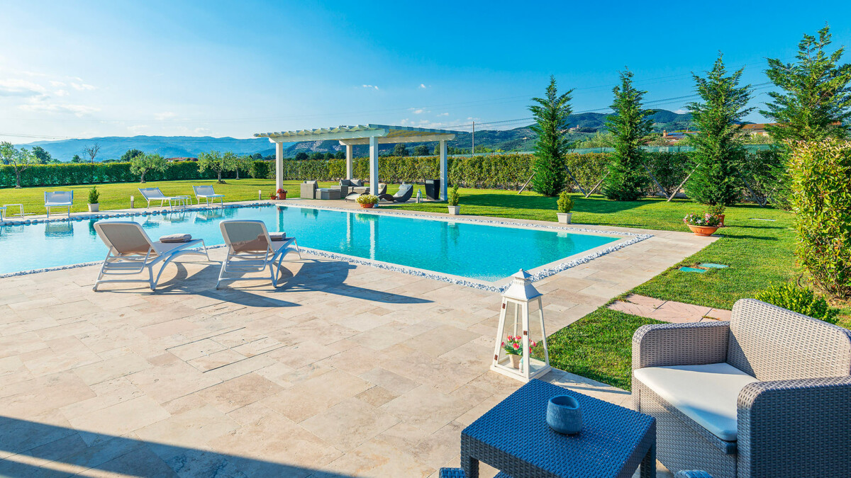 La villa est entourée d’un grand jardin bien entretenu avec une piscine en L, des chaises longues et des parasols.