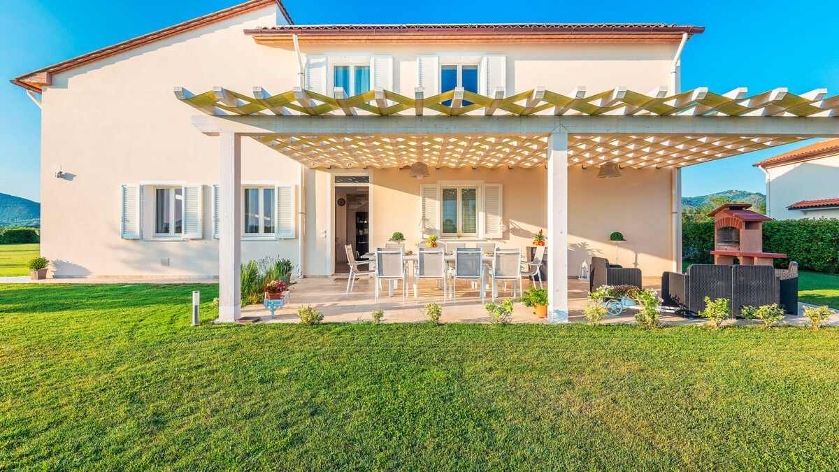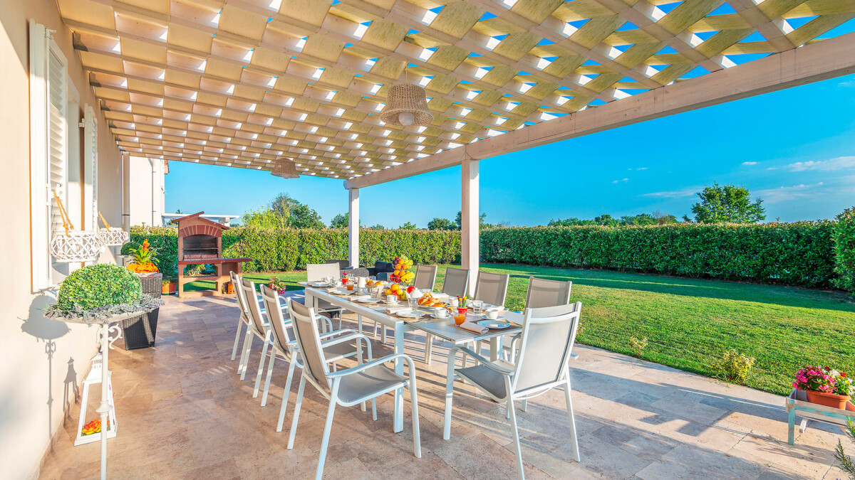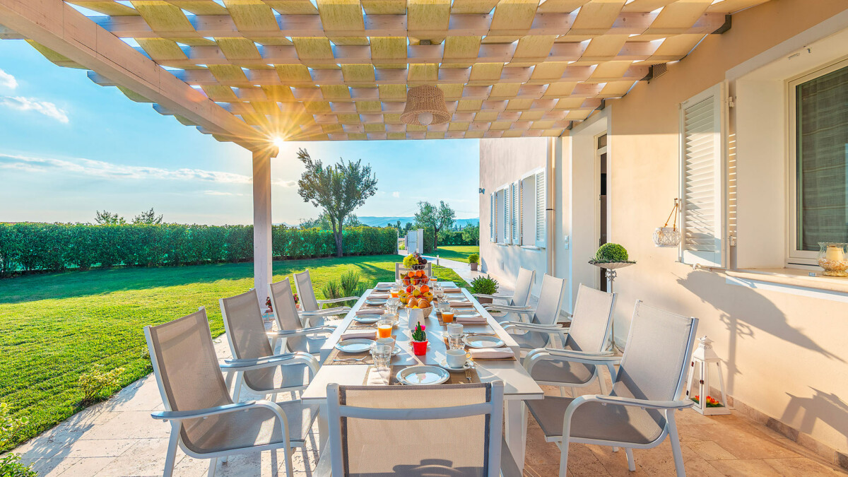 De l’autre côté de la villa, une autre terrasse avec pergola dispose d’une grande table à manger.