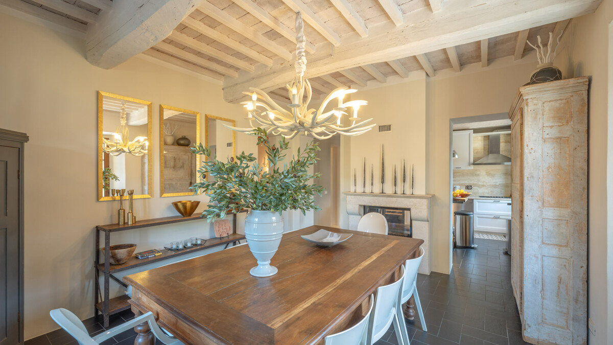 The dining room and kitchen are on either side of a beautiful fireplace. If you prefer to dine at home, there are every imaginable type of cooking utensil at your disposal. There’s a charming terrace just off the dining room, where you can enjoy a cappuccino in the quiet morning sunshine.
