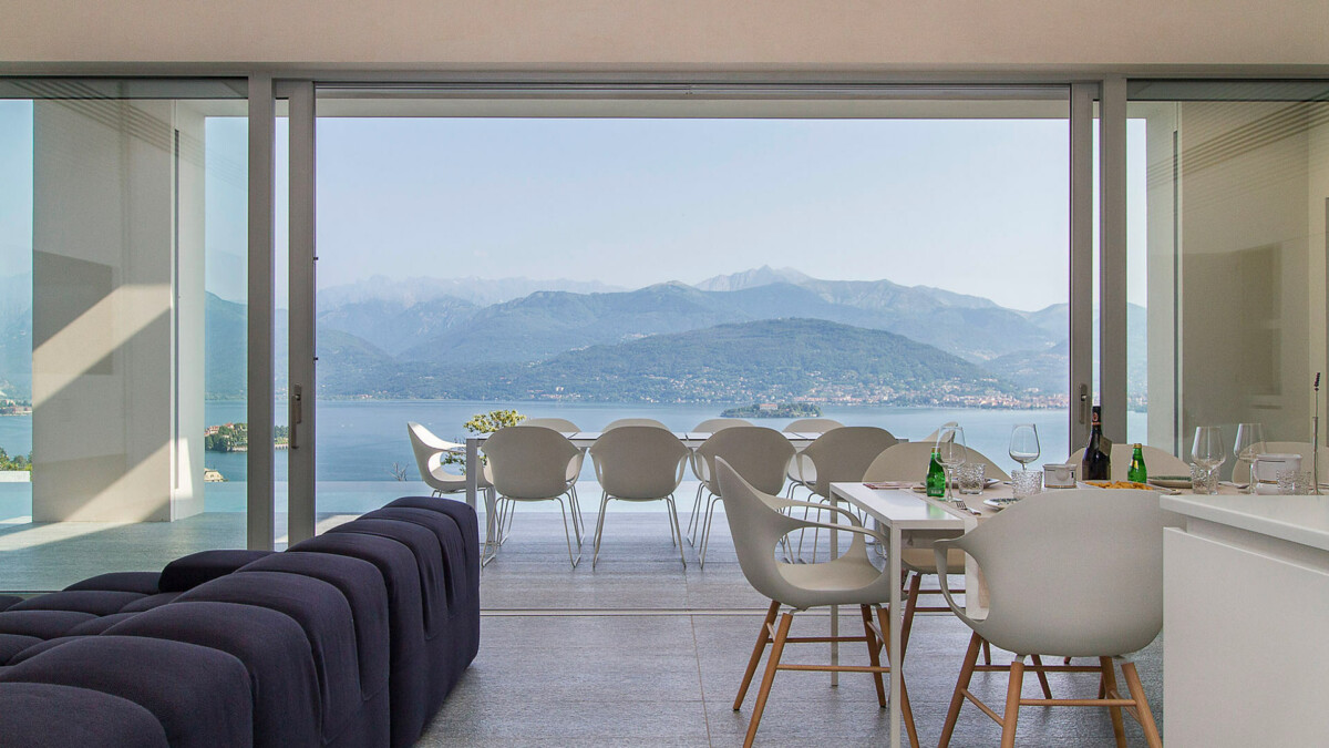 La villa, au design particulièrement moderne, est agencée sur deux étages et se compose de trois volumes, dotés de grandes baies vitrées coulissantes orientées sur le lac et de toits plats plantés de verdure, avec une vue sur la piscine à débordement (14 x 4,5 m), dont les eaux semblent jaillir directement du lac.