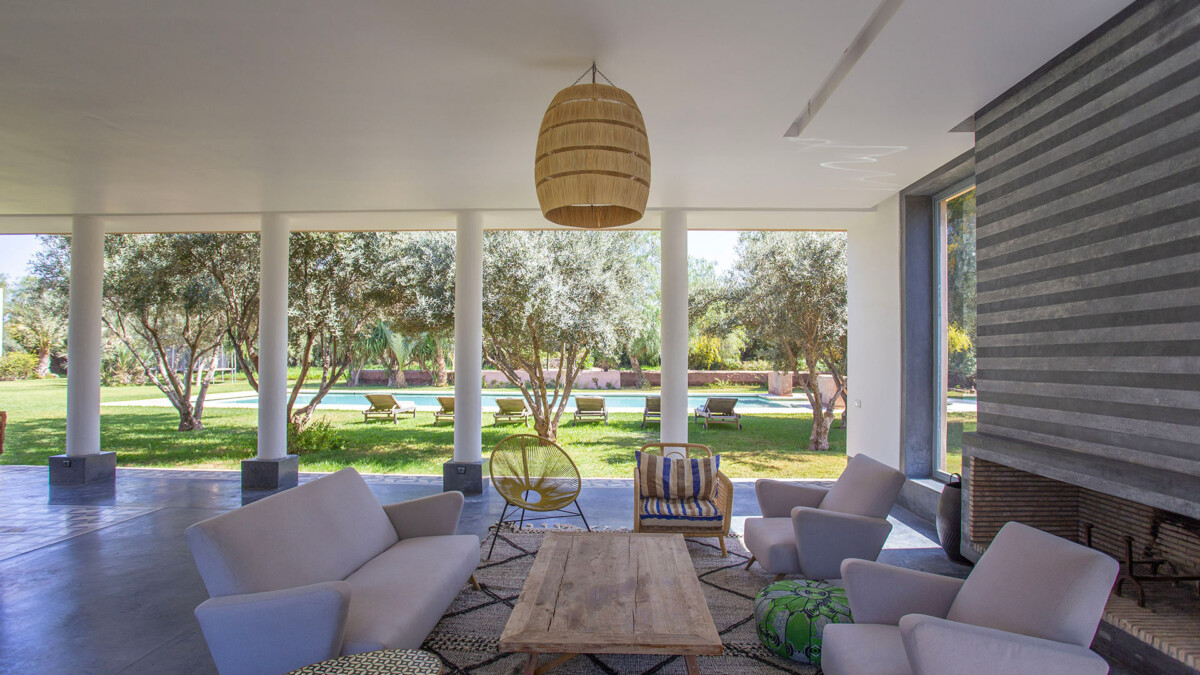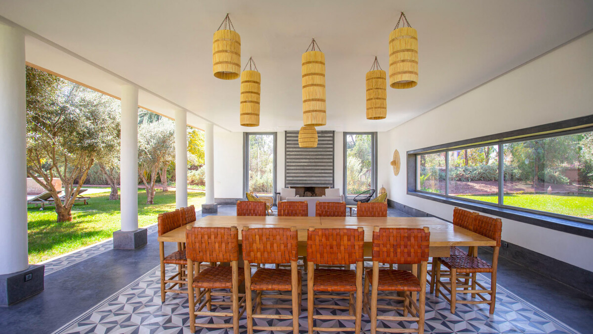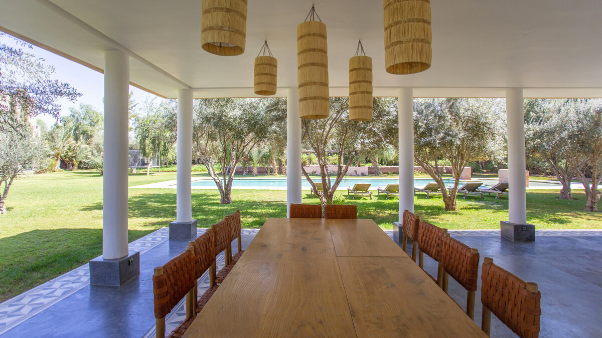 Dehors, se trouve une terrasse couverte avec canapés et table de salle à manger sous un dais, un poolhouse de 90m2 (avec une cheminée) près de la piscine avec une table à manger pouvant accueillir de 16 à 40 personnes. Ce Poolhouse est parfait également pour recevoir des séminaires de Yoga / Pilat / cours de danse.
