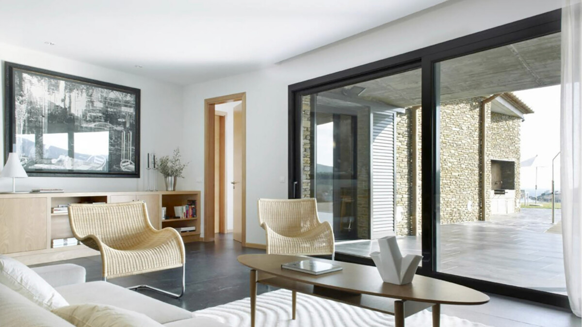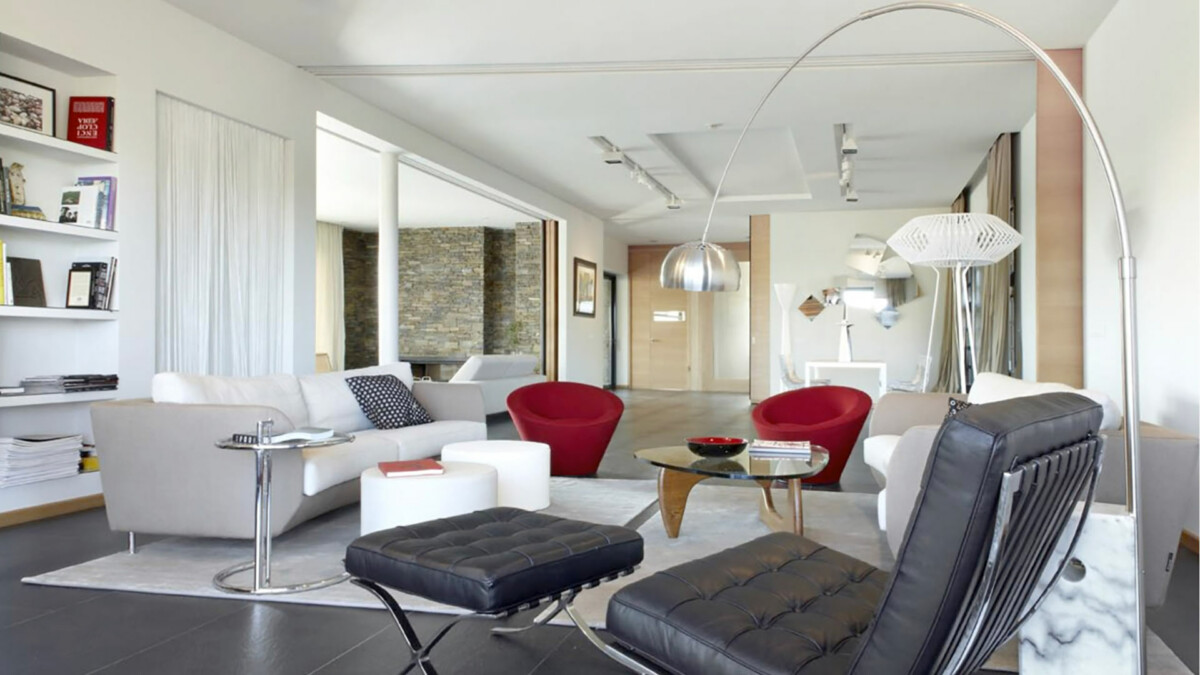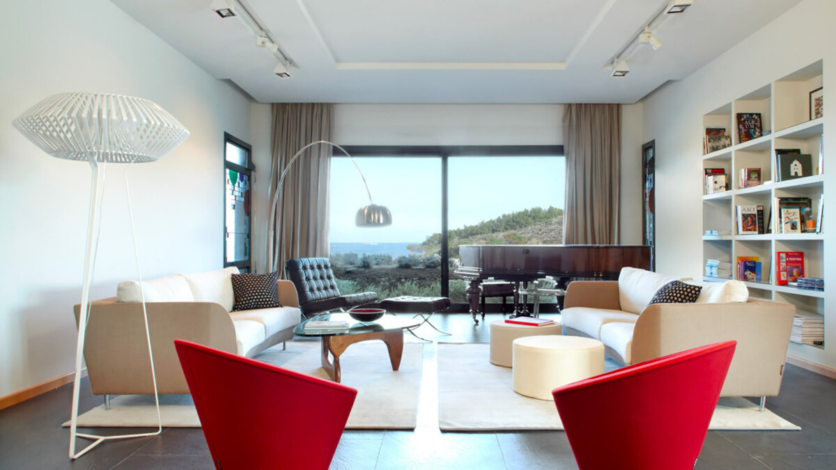 Le salon principal dispose de grandes fenêtres panoramiques avec vue sur la piscine et la baie.