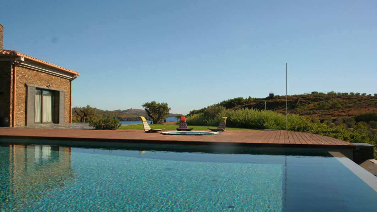 L’espace de vie extérieur surplombe la baie et comprend une grande piscine à débordement de 15 m x 7.50 m, entouré de terrasses en teck, jacuzzi chauffé, barbecue intégré, beaucoup de transats et fauteuils et d’espace pour prendre ses repas, cheminée avec ouverture extérieure. Des marches conduisent à l’étage inférieur vers le sauna, qui peut également être accessible depuis l’intérieur de la maison.