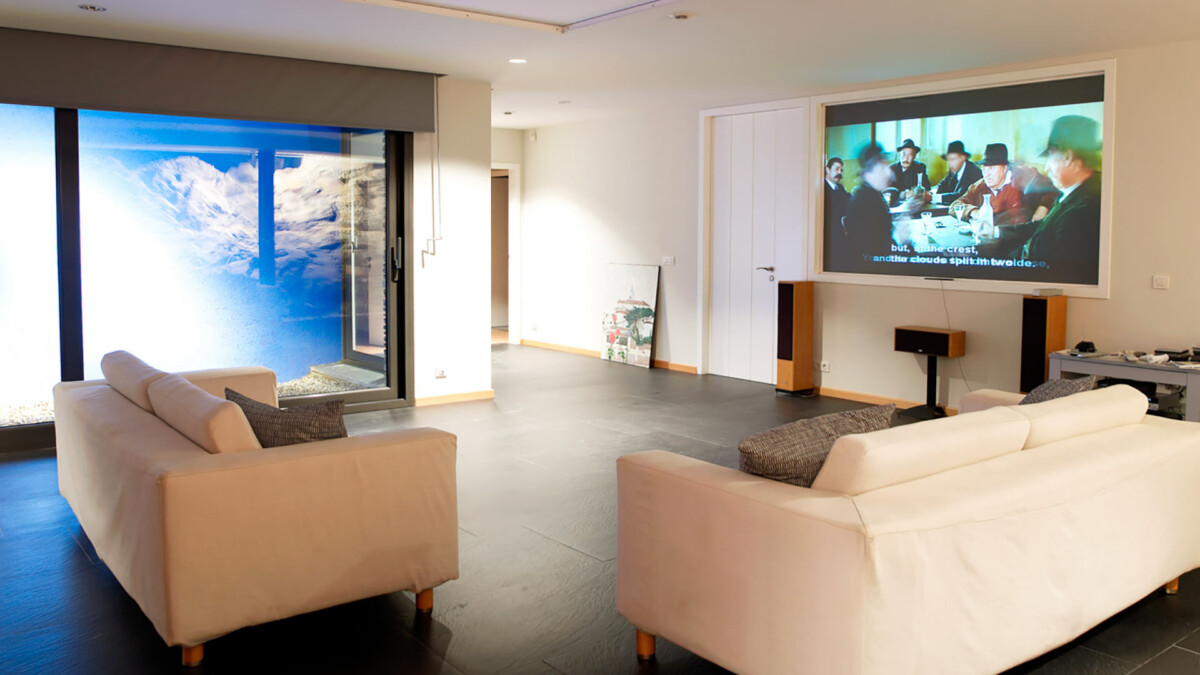 A l’étage inférieur se trouvent une autre grande salle de séjour, avec accès au sauna, des vestiaires et une aire de jeux séparée pour le tennis de table. On y trouve également un grand home-cinéma avec écran de projection.