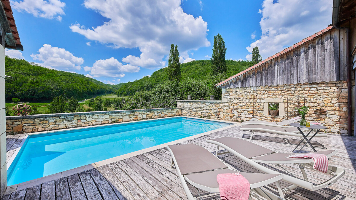 Cette belle villa du Périgord offre un magnifique panorama avec de les larges baies vitrées donnent sur la vallée boisée et le parc privé. La maison dispose de pièces spacieuses et lumineuses qui en font un havre de paix.  Elle propose 3 belles chambres et salle de bain avec une décoration raffinée.