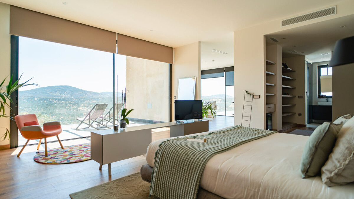 Chambre, 1er étage. La chambre propose 1 lit double. Salle de bain privée, avec douche. WC dans la salle de bain. La chambre inclut également : climatisation, canapé, coin bureau, TV, dressing, terrasse privée.