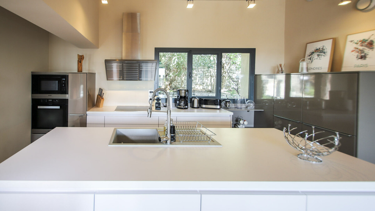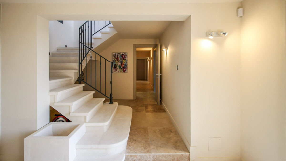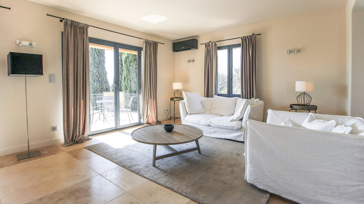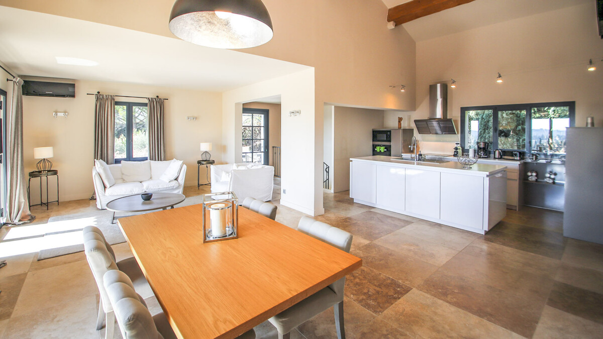 Le premier étage est accessible par le biais d’un très bel escalier en pierre et comporte un vaste séjour composé d’un coin salon avec télévision, d’une salle à manger et d’une grande cuisine entièrement équipée. Depuis le séjour, il est possible d’apprécier une magnifique vue sur la piscine de la villa. A ce niveau, se trouve également la dernière chambre de la maison : une suite parentale avec baignoire centrale, douche à l’italienne et dressing.