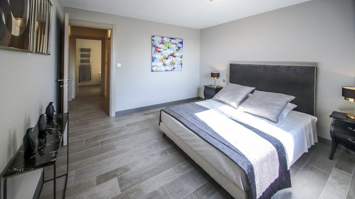 Chambre, Rez-de-chaussée. La chambre propose 1 lit double 160 cm. Salle de bain privée, avec douche à l’italienne. La chambre inclut également : climatisation, dressing.