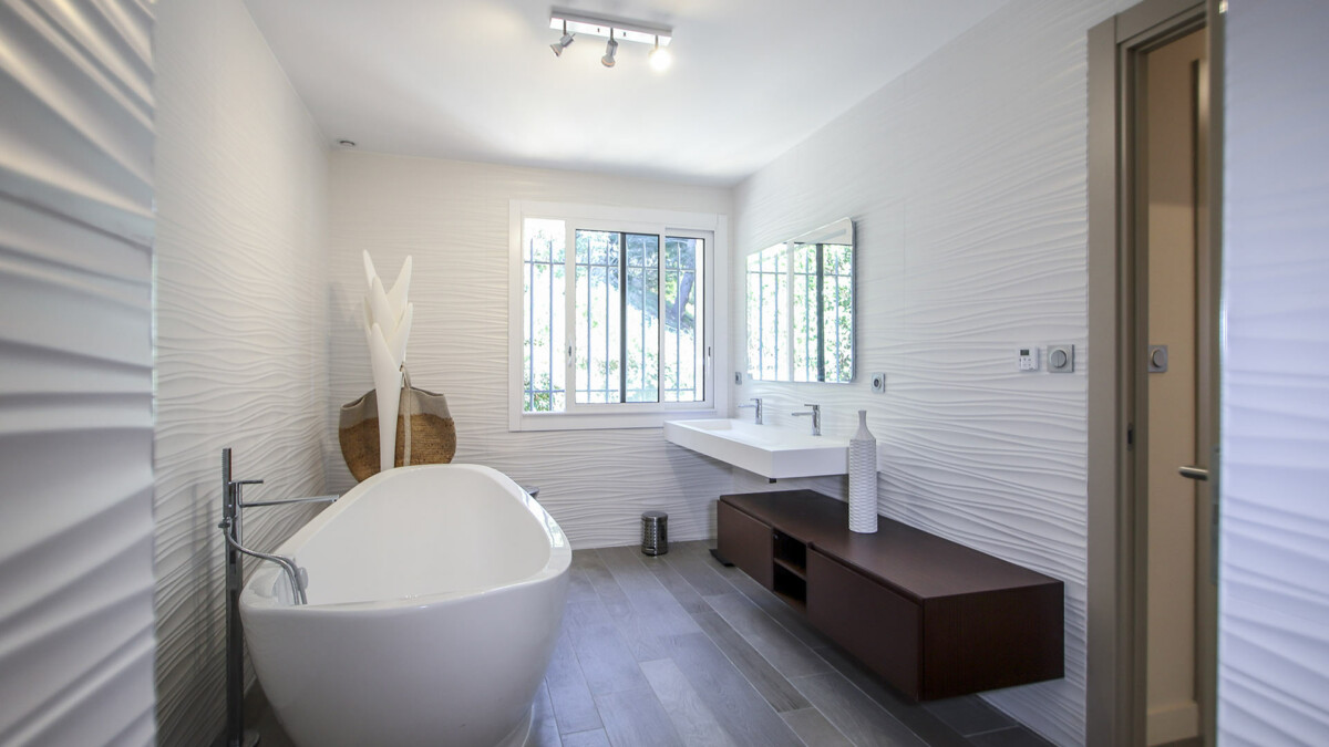 Chambre, Rez-de-chaussée. La chambre propose 1 lit double 160 cm. Salle de bain privée, avec baignoire avec pommeau de douche, douche à l’italienne. WC dans la salle de bain. La chambre inclut également : climatisation, salon, dressing.