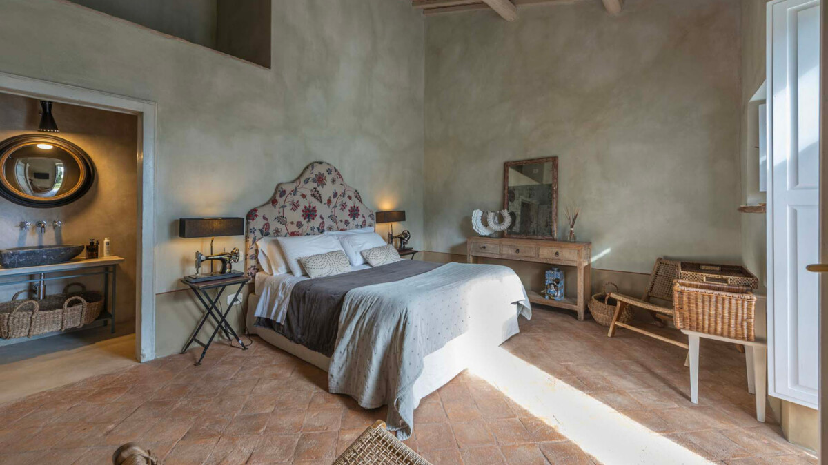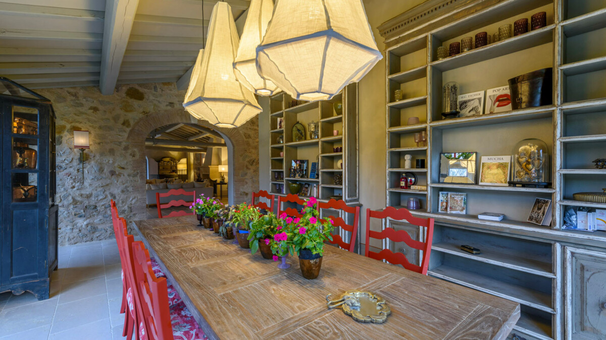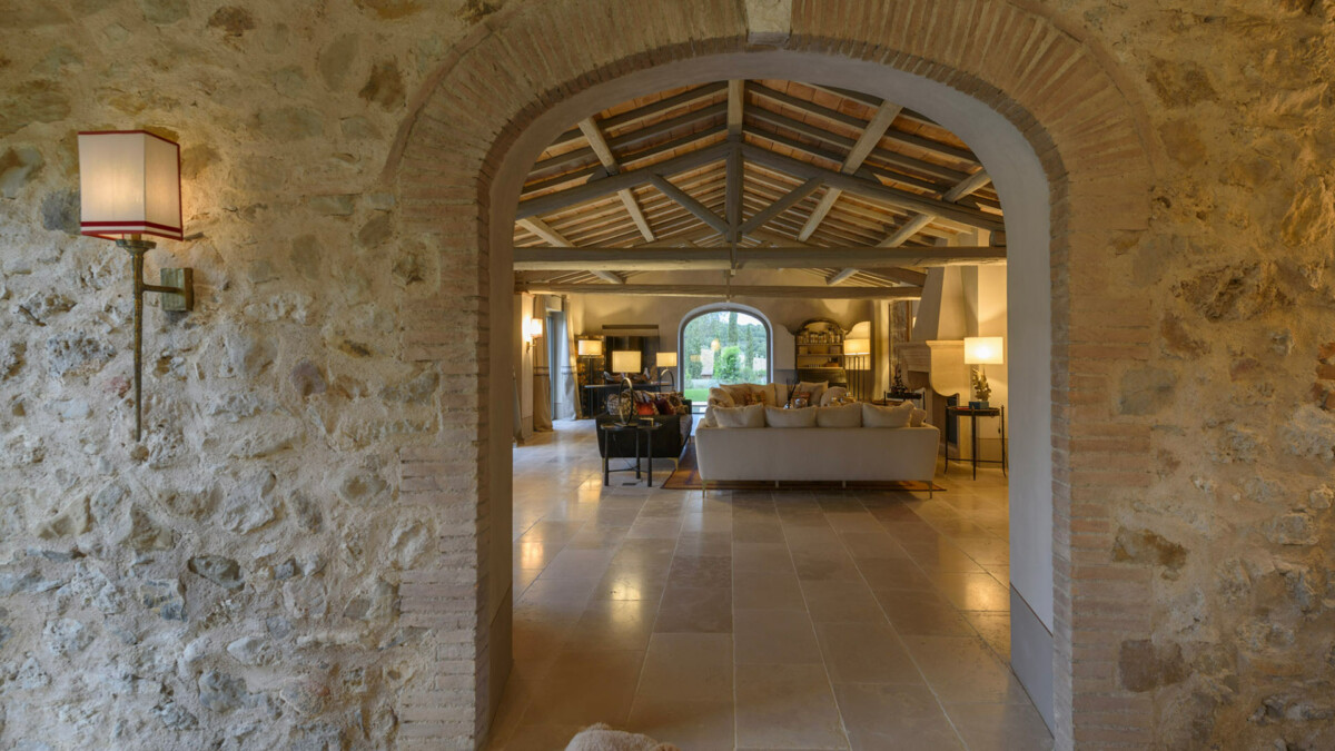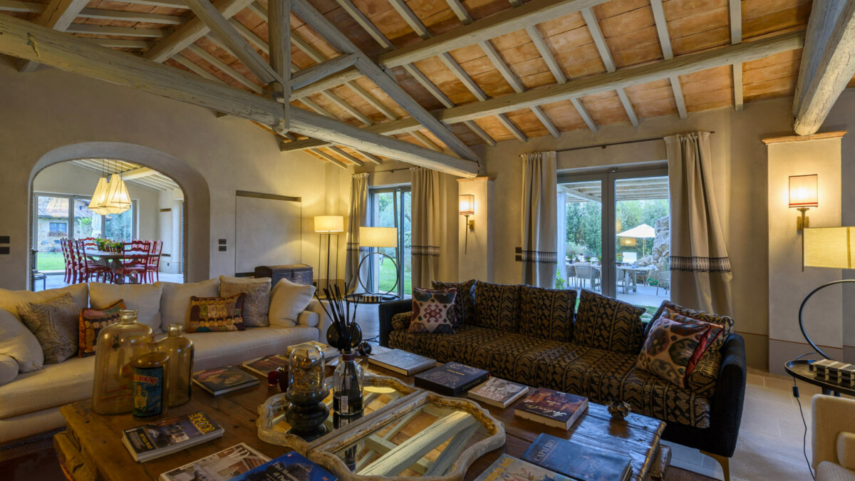 Les espaces intérieurs allient tradition toscane et modernité. Le salon baigné de lumière, prolongé par une cheminée en pierre et de larges canapés, invite à la détente ou aux soirées conviviales. La salle à manger attenante permet de partager les spécialités locales dans un cadre élégant. La cuisine professionnelle est parfaitement équipée pour les amateurs de gastronomie, avec piano de cuisson, cave à vin, double réfrigérateur et machines à café. Un espace bien-être avec sauna et coin relaxation, ainsi qu’une buanderie, complètent les prestations.
