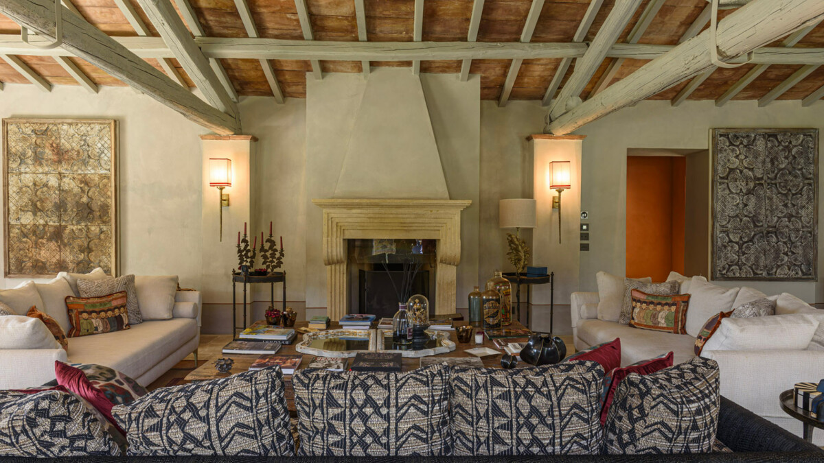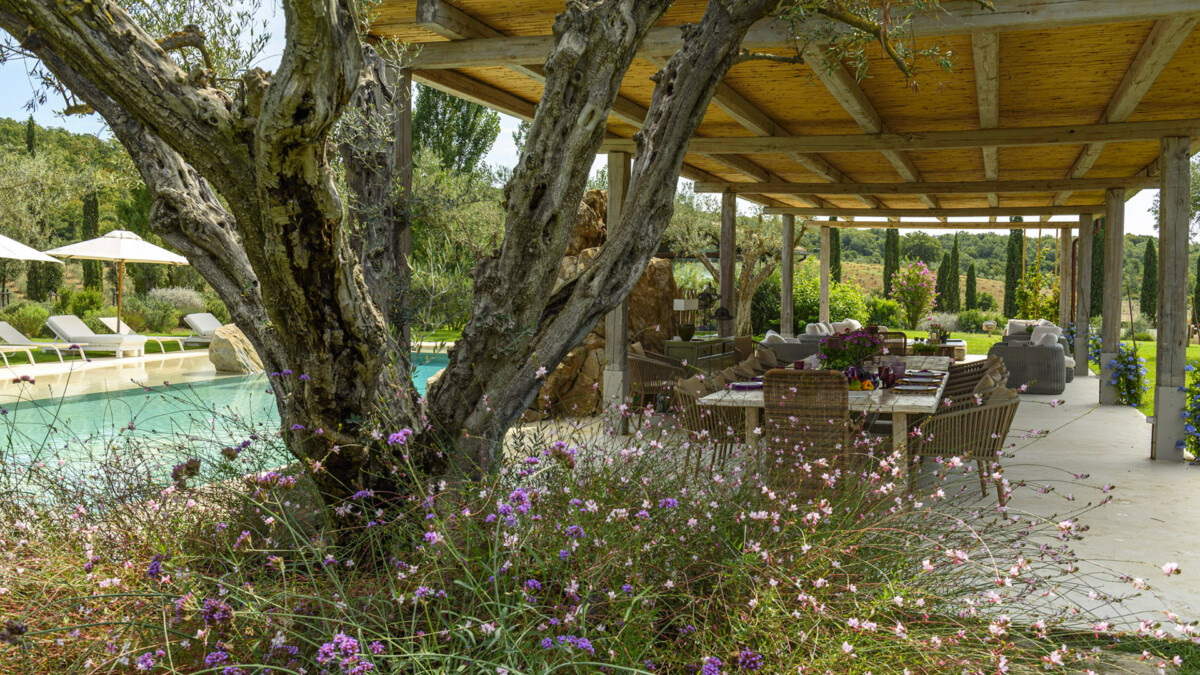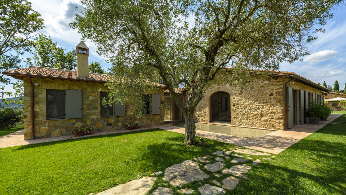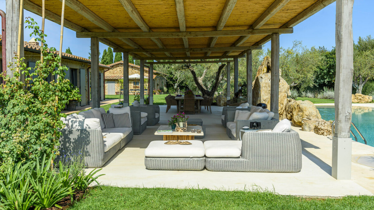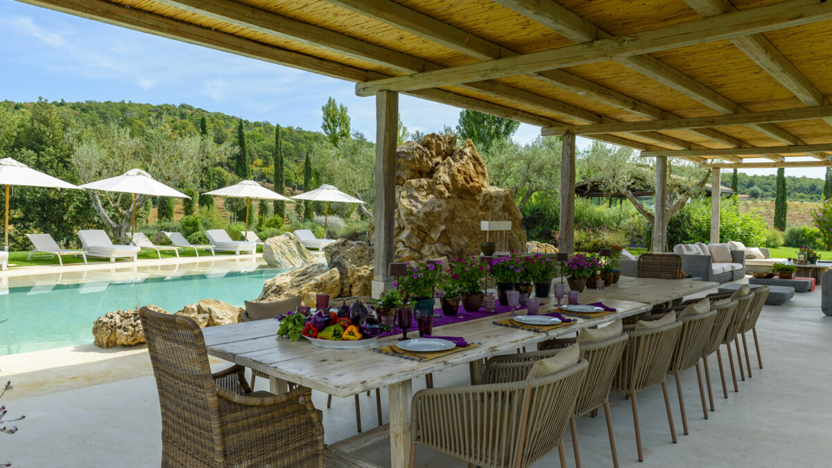 Les espaces intérieurs allient tradition toscane et modernité. Le salon baigné de lumière, prolongé par une cheminée en pierre et de larges canapés, invite à la détente ou aux soirées conviviales. La salle à manger attenante permet de partager les spécialités locales dans un cadre élégant. La cuisine professionnelle est parfaitement équipée pour les amateurs de gastronomie, avec piano de cuisson, cave à vin, double réfrigérateur et machines à café. Un espace bien-être avec sauna et coin relaxation, ainsi qu’une buanderie, complètent les prestations.