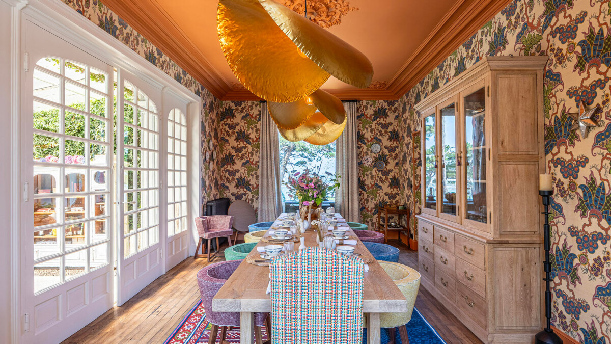 Dès l’entrée, vous êtes dirigés vers le salon des invités, à la fois chic et accueillant. Là, la vue sur l’océan et les majestueux pins crée un paysage enchanteur. La cheminée, pièce maîtresse du salon, est flanquée de deux canapés Chesterfield revêtus de tissu en laine « Tara Natural » de Pierre Frey, aux larges rayures. Deux fauteuils crapauds, habillés d’un tissu coloré « Animal enchanté » de Clarence House, ajoutent une note tropicale à l’ensemble.
