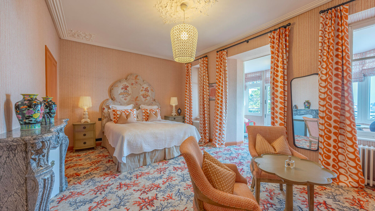 Chambre, 1er étage, vue sur la mer. La chambre propose 1 lit double 180 cm. Salle de bain privée, avec baignoire, douche à l’italienne. WC dans la salle de bain. La chambre inclut également : salon, TV, coffre fort.