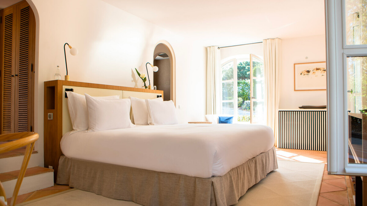 La maison possède 6 chambres, 5 sont de plain-pied tandis que la 6ème est située à l’étage et bénéficie d’une terrasse tropézienne privée qui domine la baie.