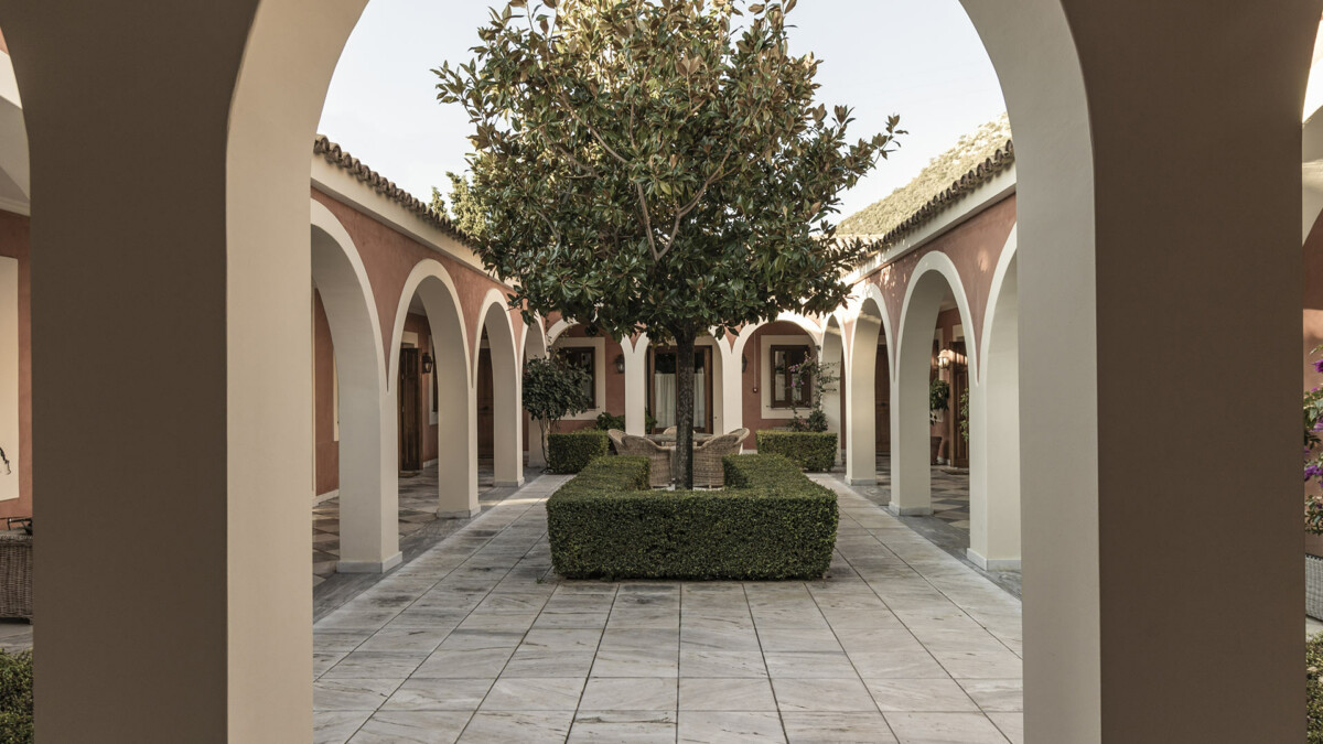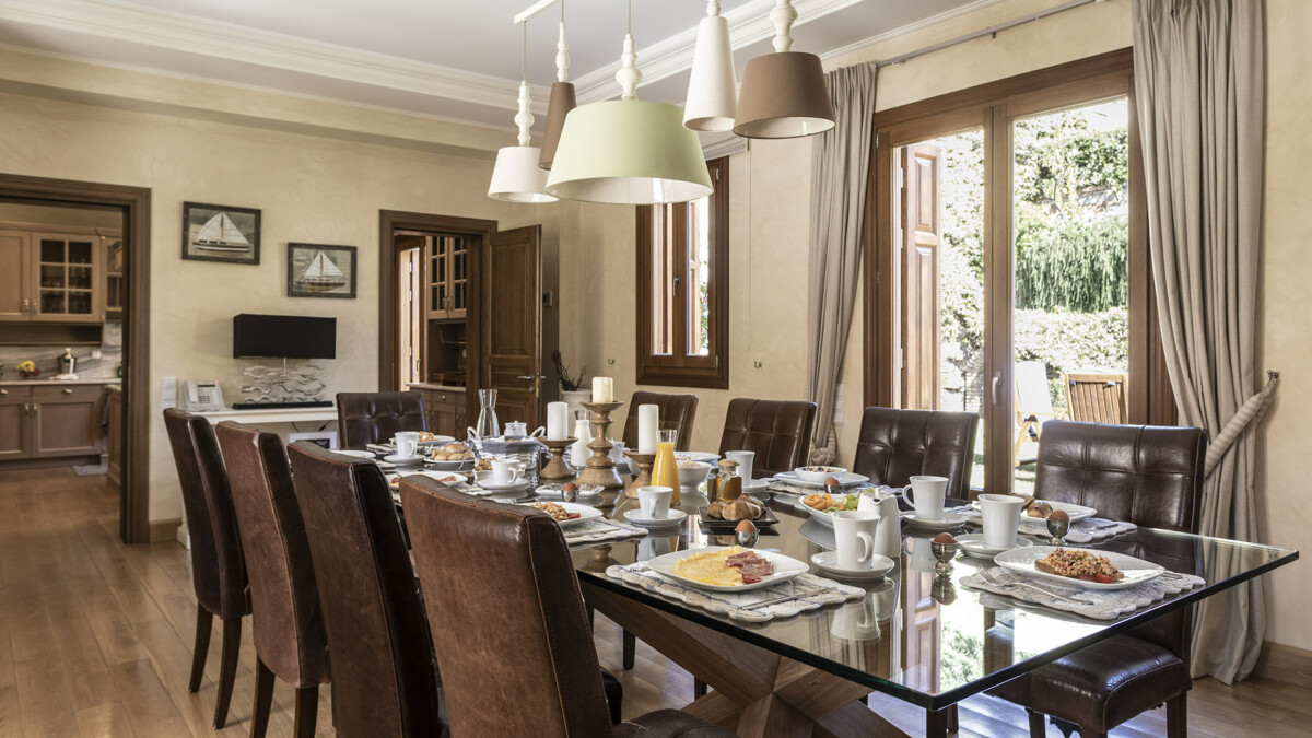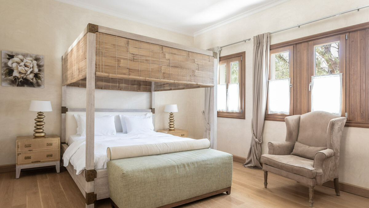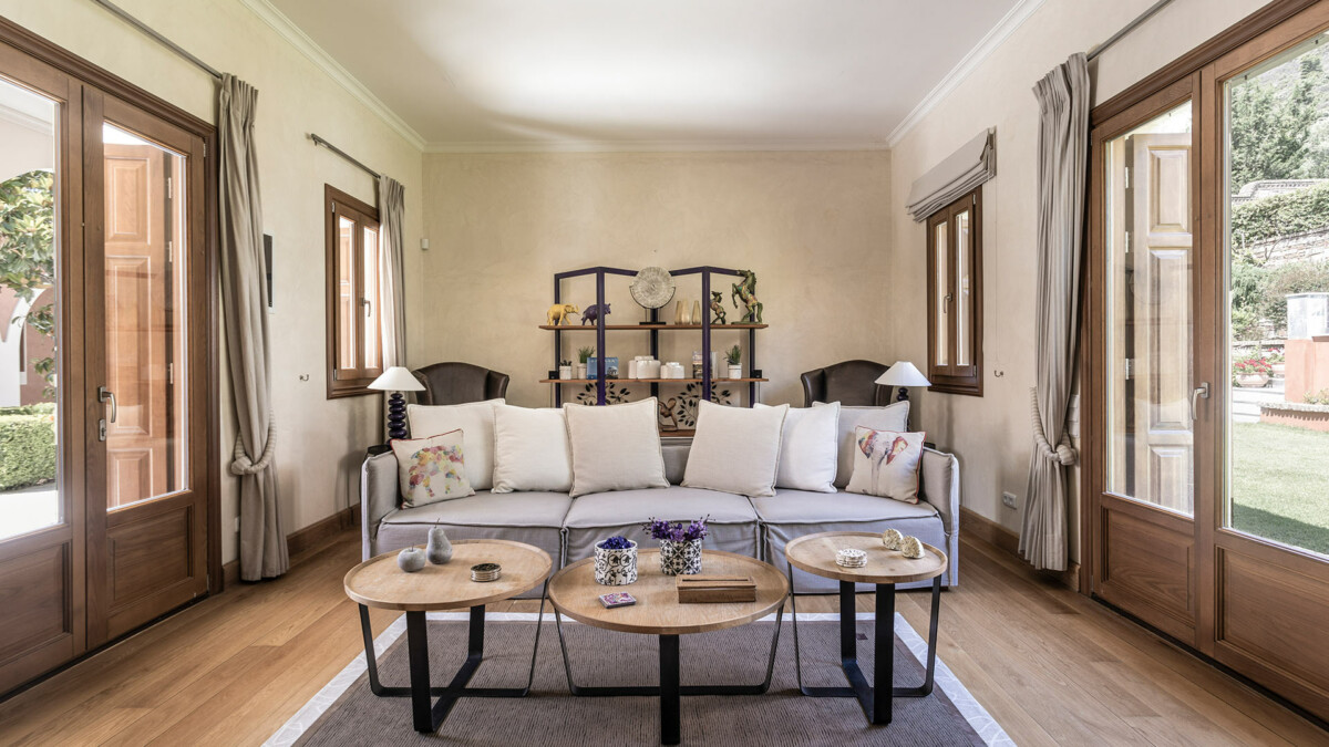 Pensée pour allier grandeur et intimité, la villa dispose de cinq suites au style unique, allant de 26 à 65 m², avec de hauts plafonds, des salles de bain privatives et un mobilier sur mesure. Les espaces de vie comprennent un salon chaleureux à la décoration soignée, une salle à manger généreuse, et une cuisine entièrement équipée ouverte sur le patio central. De grandes baies vitrées baignent l’ensemble de lumière naturelle et assurent une connexion fluide entre l’intérieur, le jardin et les terrasses. Un pool house indépendant ainsi qu’un garage pour deux voitures complètent l’agencement réfléchi de la villa, tandis qu’un patio inspiré des monastères invite au repos et à la convivialité.