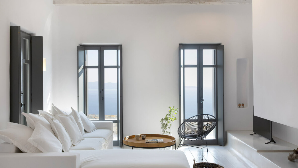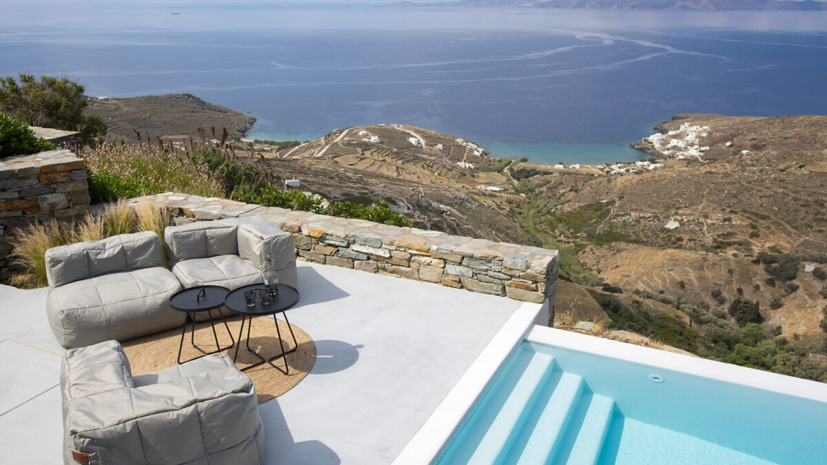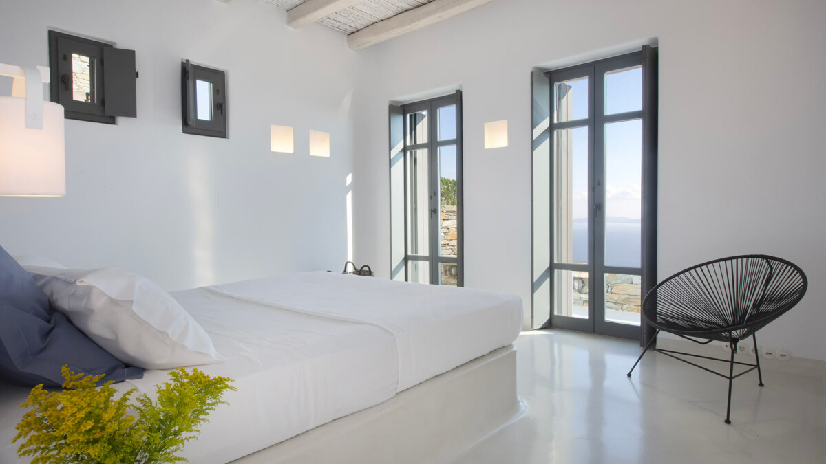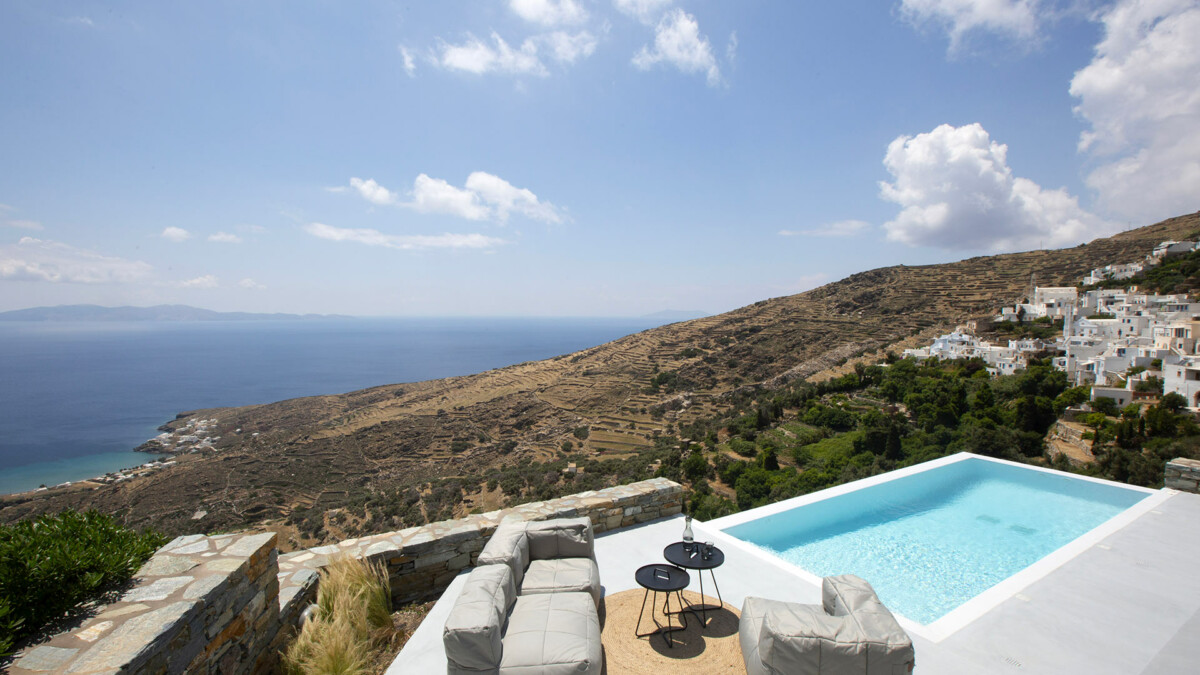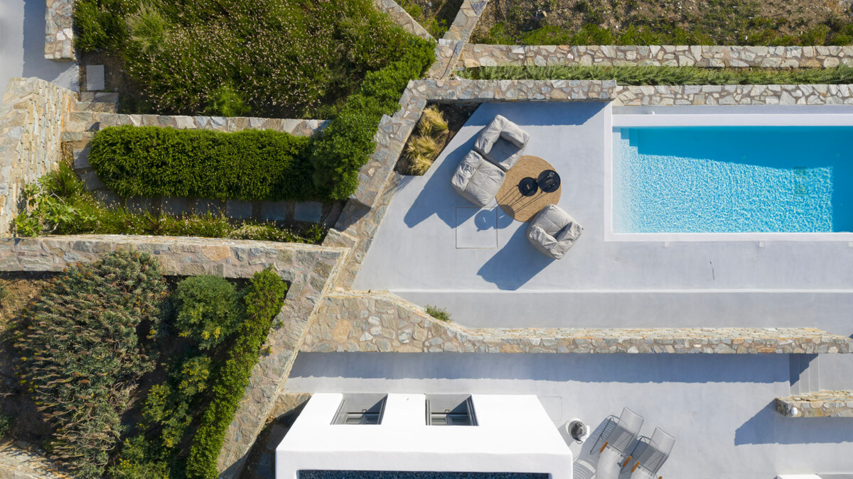 Les espaces extérieurs, soigneusement aménagés, se composent d’une piscine à débordement, d’un jardin méditerranéen luxuriant et d’un coin salon ombragé pour des moments de détente absolue. Ces espaces vous offrent un panorama magique, avec des vues à perte de vue sur Kardiani et la mer Égée scintillante, tout particulièrement au coucher du soleil.