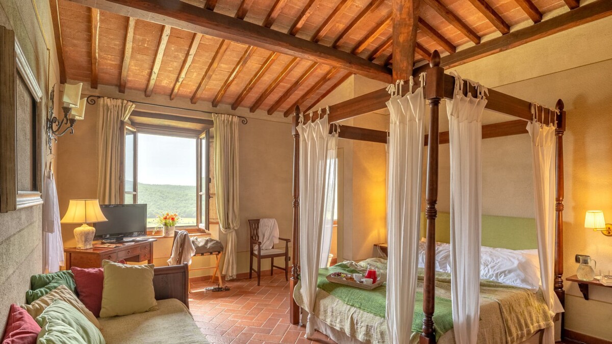 Le jacuzzi situé à l’intérieur de l’annexe de la villa est conçu avec des plafonds à poutres apparentes et de grandes fenêtres pour vous permettre de profiter du paysage: idéal pour une détente privée ou des moments romantiques.