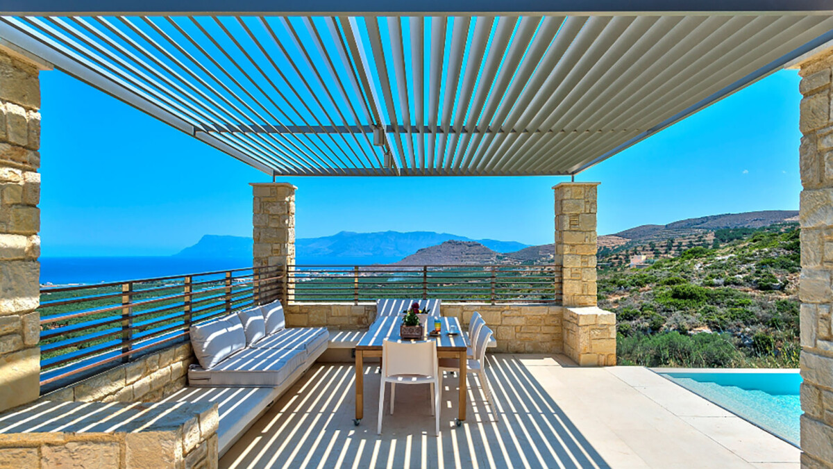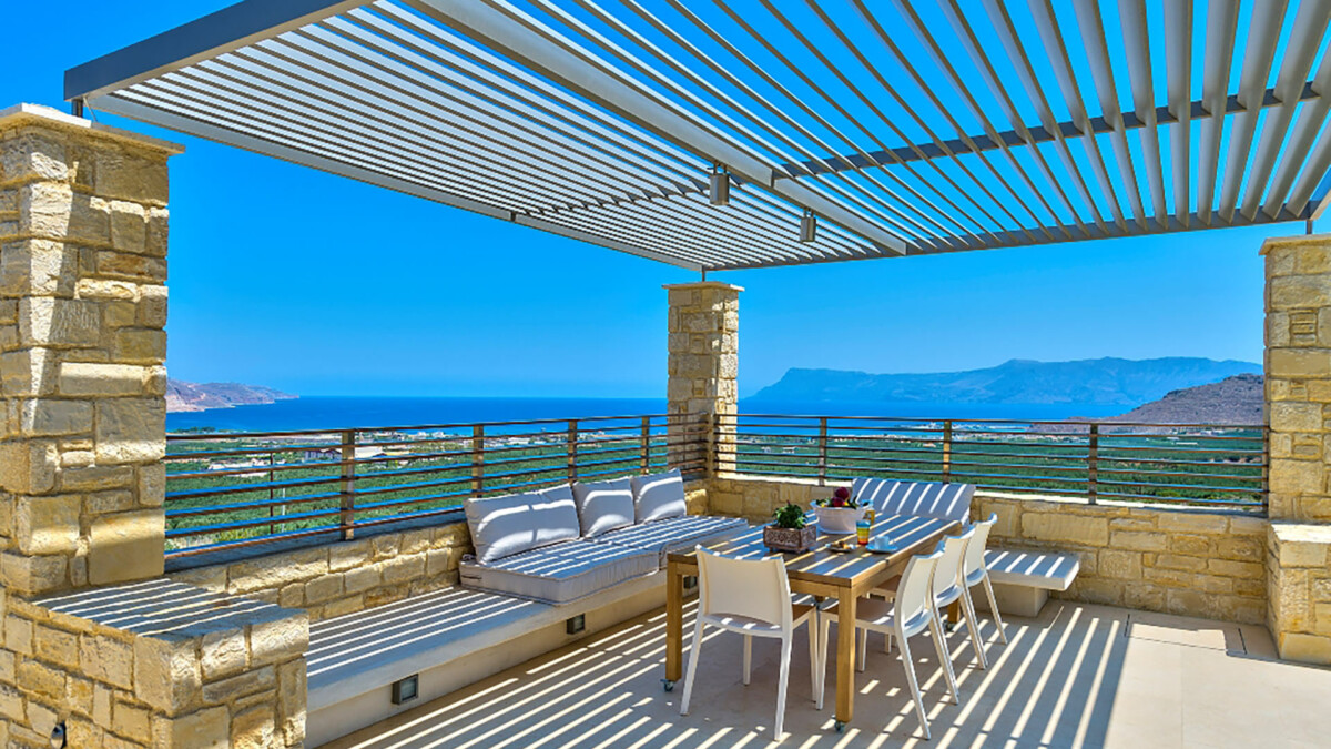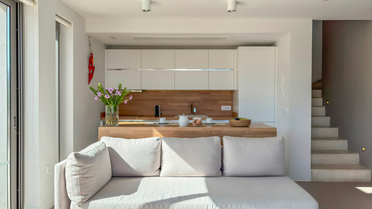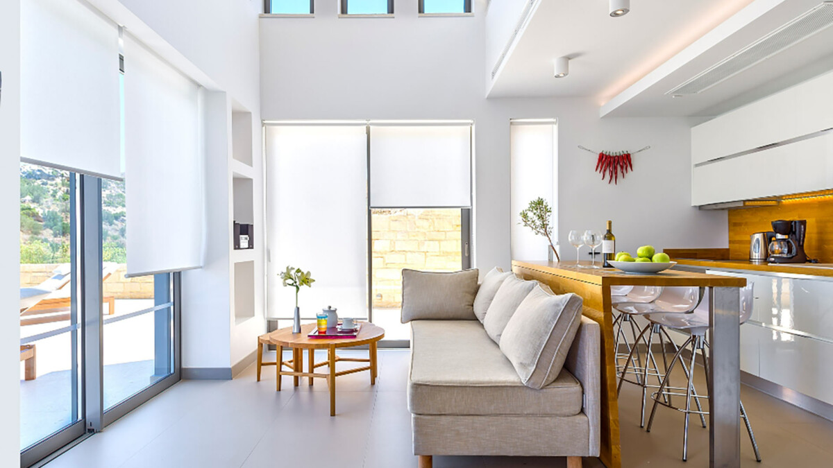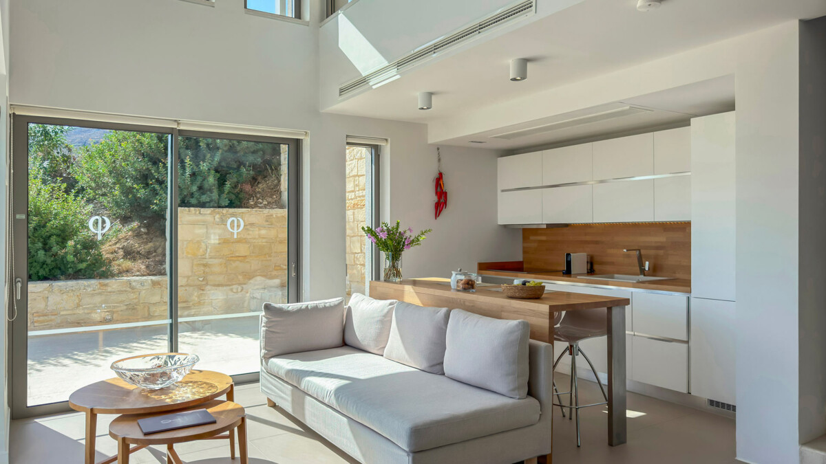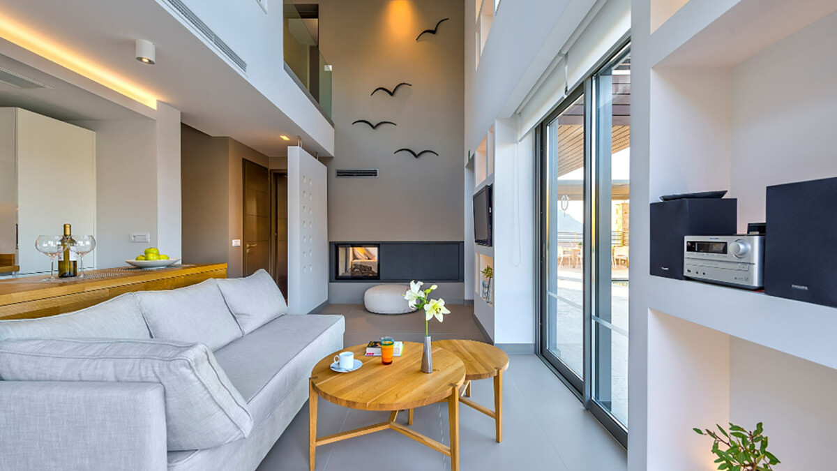 L’entrée principale s’ouvre sur un salon de deux étages qui a de nombreuses grandes fenêtres qui permettent le flux de lumière afin d’ ajouter à l’atmosphère générale aérée de cette villa une touche moderne. L’architecte d’intérieur local talentueux Stavroula Mauromataki, a décoré avec goût partout la propriété avec des peintures et de la poterie unique venant d’ artistes grecs locaux.