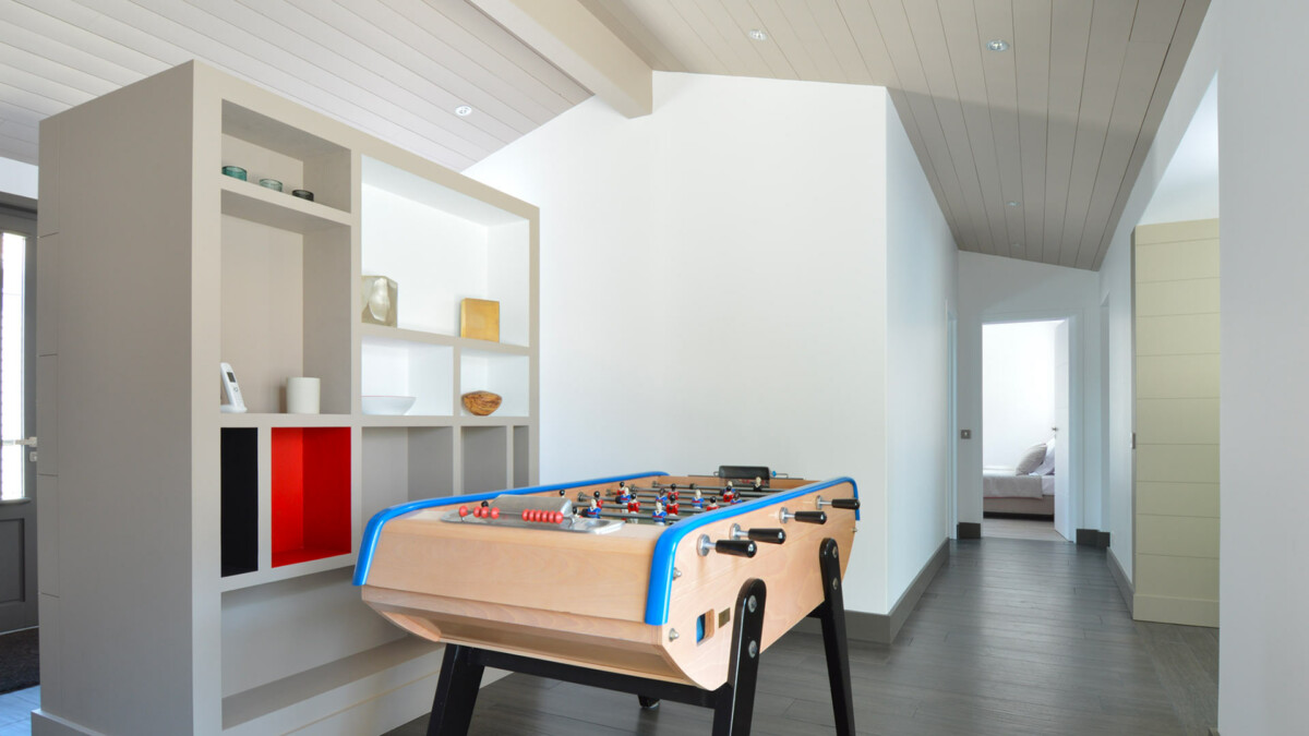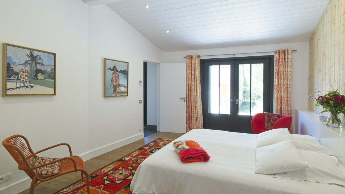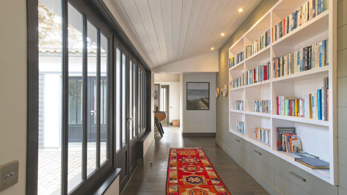 Pensée dans les moindres détails par ses propriétaires pour accueillir très confortablement dix personnes à toutes saisons, elle a été conçue sur un plan en H, l’aile « vie » côté jardin et l’aile « chambres » étant reliées par une galerie-bibliothèque.