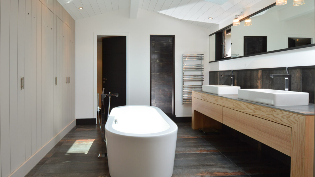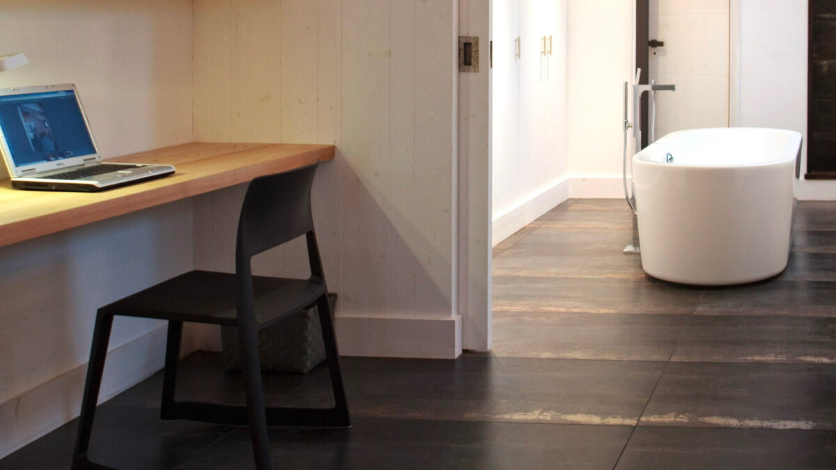 Côté chambres, la suite parentale à droite de l’entrée incorpore un espace bureau séparé par des portes à galandage et une vaste salle de bain en enfilade. Deux autres chambres, chacune avec sa salle de douche privative, se situent de l’autre côté de l’entrée. Toutes les chambres sont équipées d’un bureau, permettant de travailler à distance.