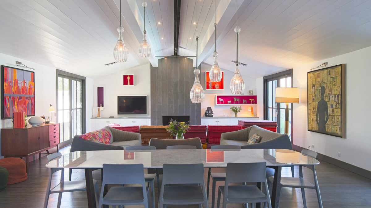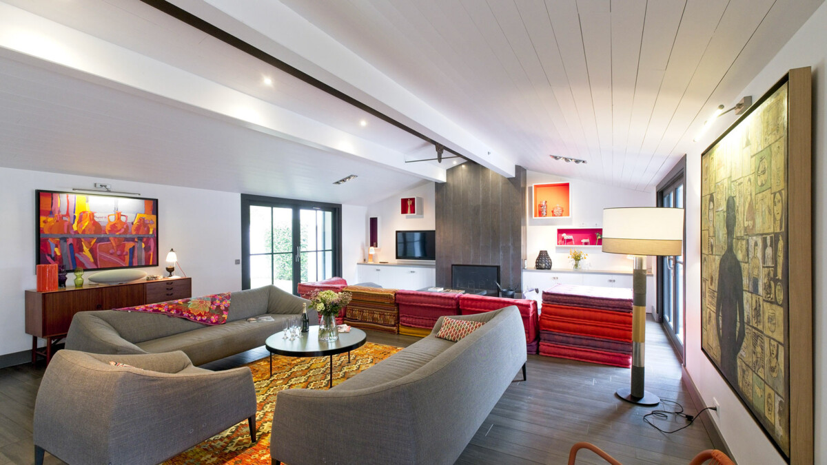 La maison comprend un vaste salon transversal de quelques 100m2 qui bénéficie d’une double exposition est-ouest et donne d’un côté sur la piscine et de l’autre sur un jardin intérieur. Cet espace de vie exceptionnel se prolonge vers l’extérieur par une salle à manger d’été recouverte d’une terrasse / préau complétée par une cheminée extérieure permettant d’y dîner par tous les temps.