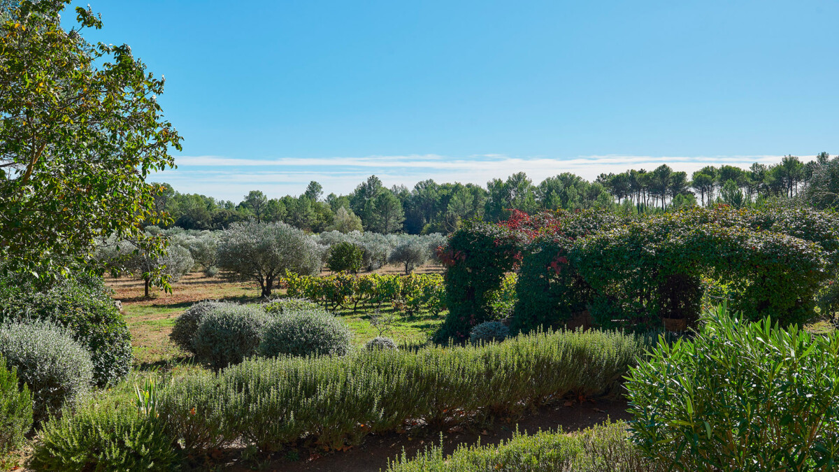 Nichée au cœur du domaine, la villa offre une vue panoramique sur un vignoble.