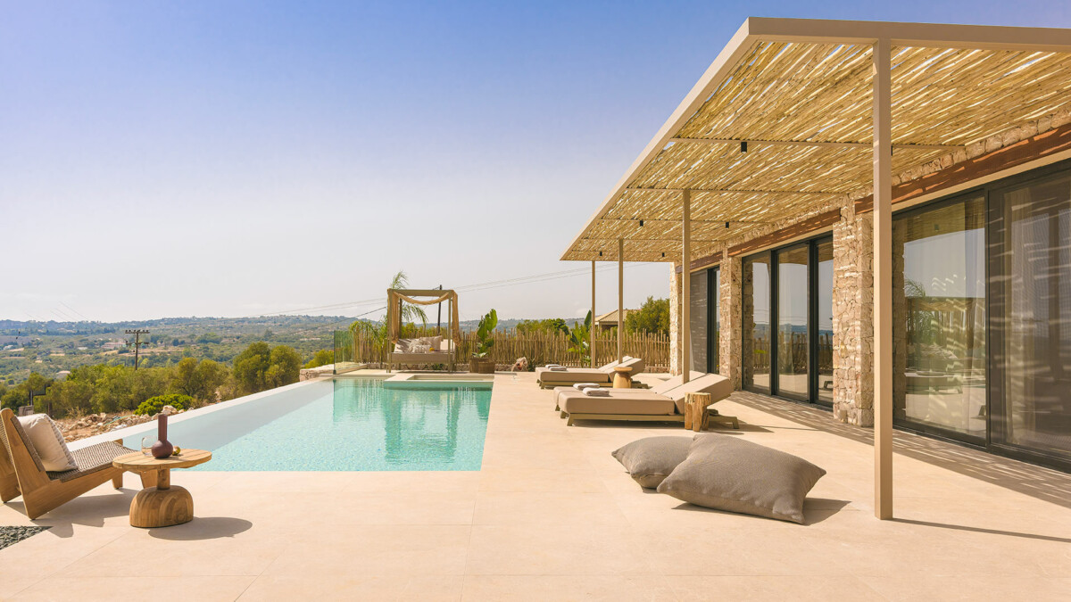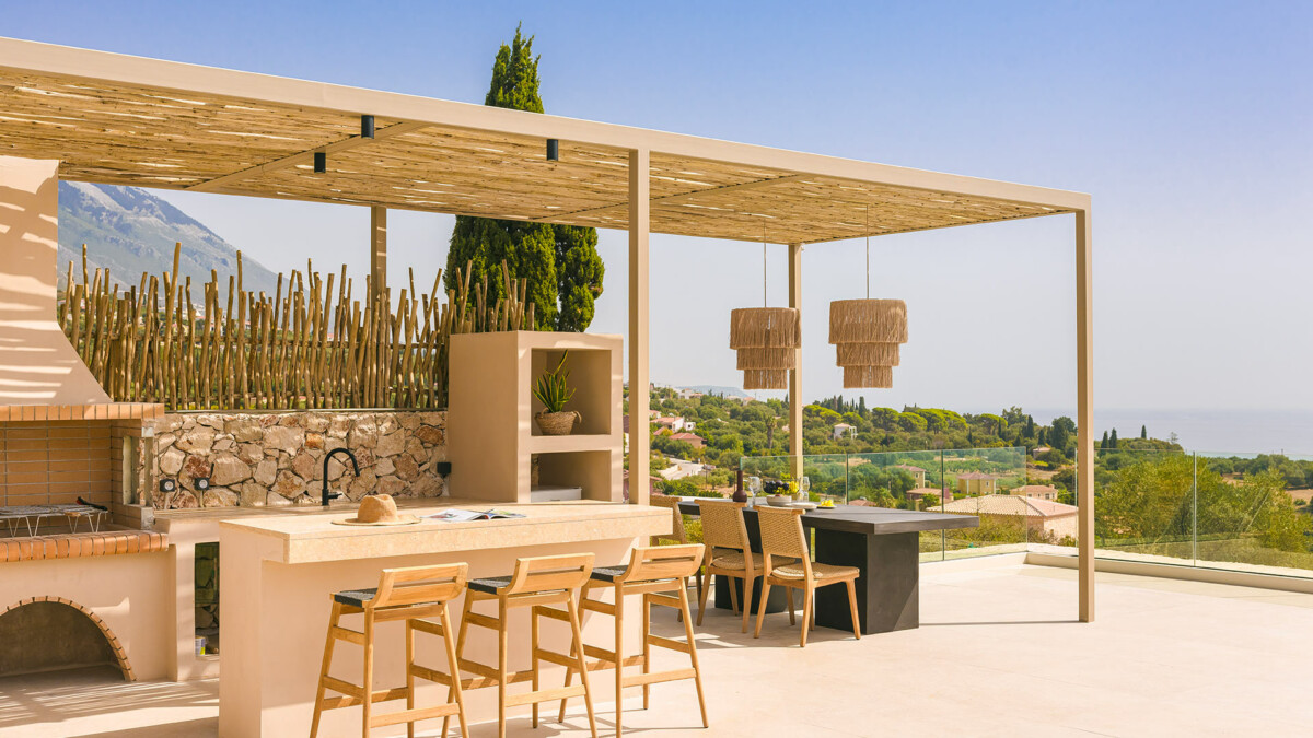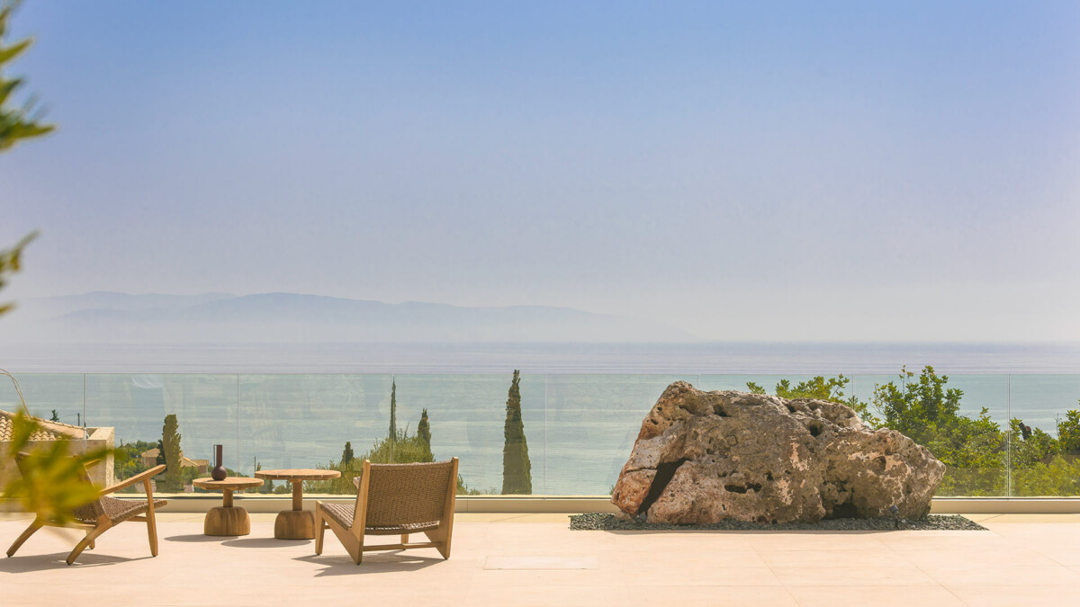 L’espace de vie spacieux de la villa est décoré dans des tons terrestres et comprend une cuisine ouverte entièrement équipée. Une table à manger en granit brésilien sur mesure est la pièce maîtresse de cet espace. Les fenêtres offrent une vue imprenable sur la piscine scintillante, la mer Ionienne et la côte de Kefalonia. L’ambiance est luxueuse tout en restant décontractée et intemporelle.