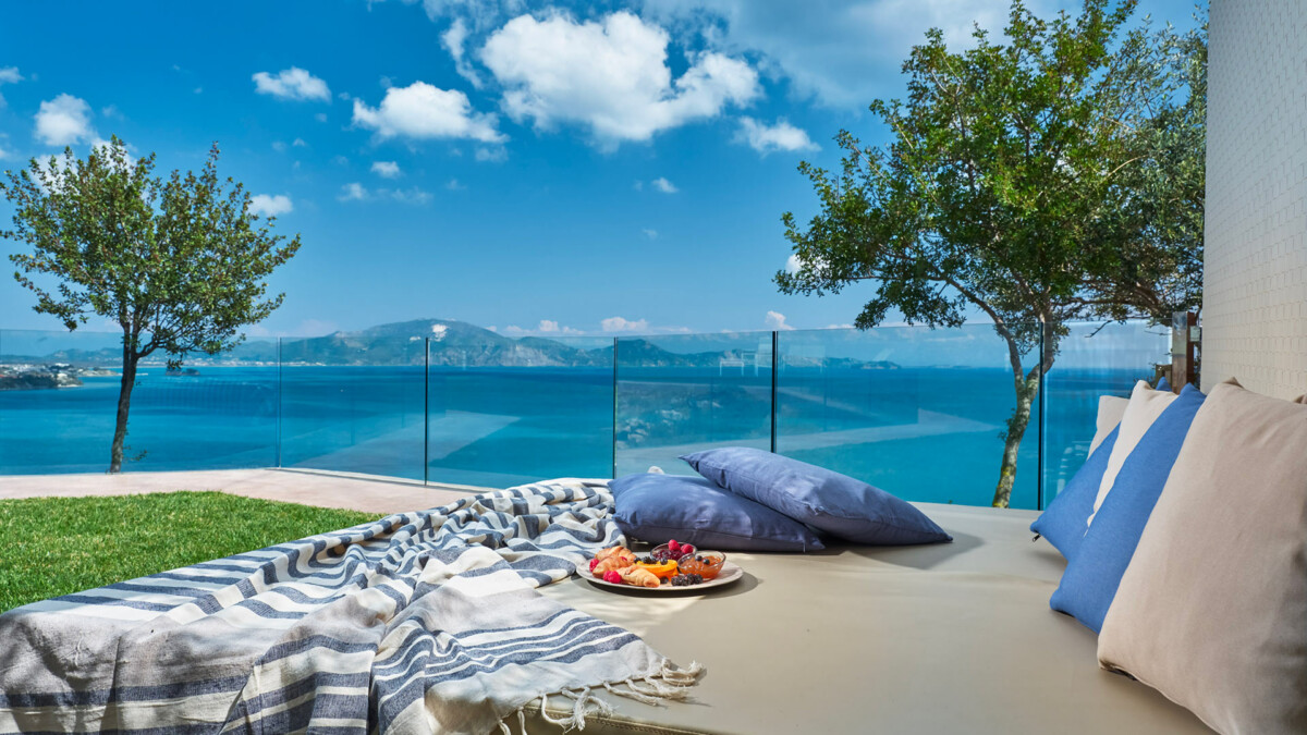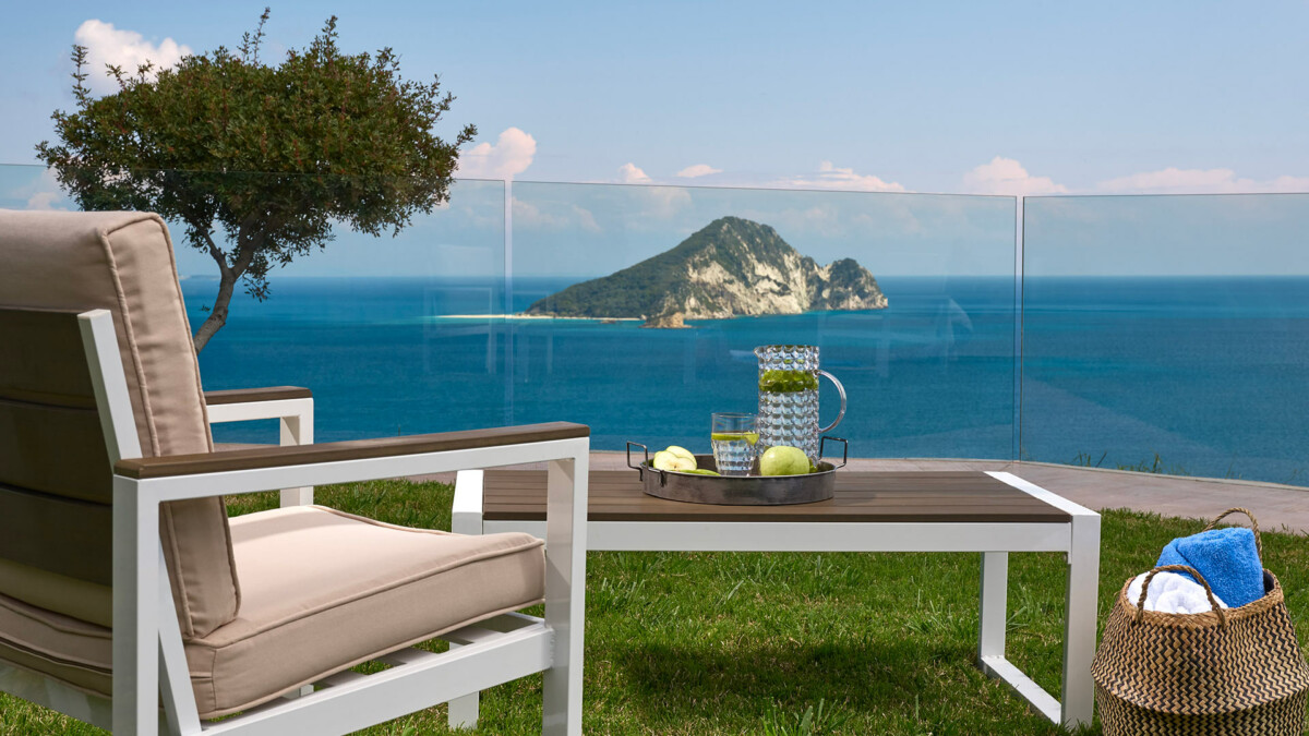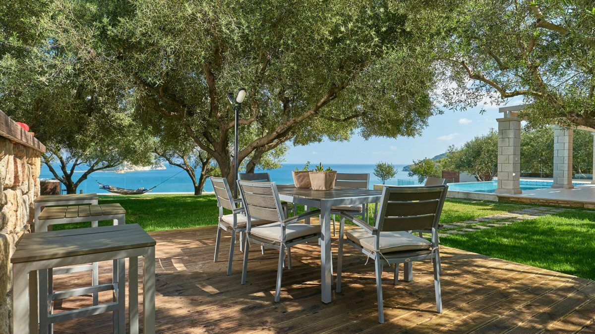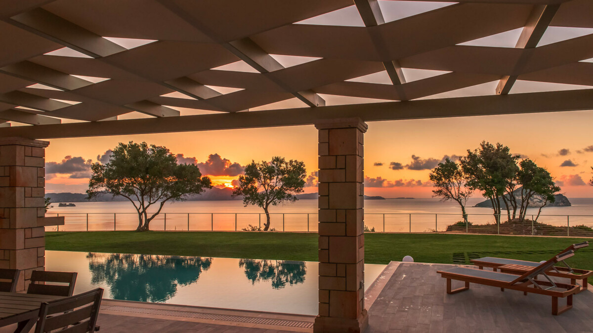 The private swimming pool 10 meters x 5 meters also have an inpool hydro and air massage. The pool is surrounded by a lush garden looking out to a magnificent view of the Ionian Sea and the isle of Marathonisi. Its waterfall effect is amazing. A jacuzzi is also at your disposal at the villa. Lots of outdoor living space are available, large terraces with sunbeds, pool chairs and pool umbrellas allowing guests to sit, relax and enjoy the sunset. There is a barbecue area-grill, an outdoor kitchen, a dining area where guests can sit and have their meal. For those who loves yoga, they can make maximum use of the Alfreso yoga area. A play area is available for children.