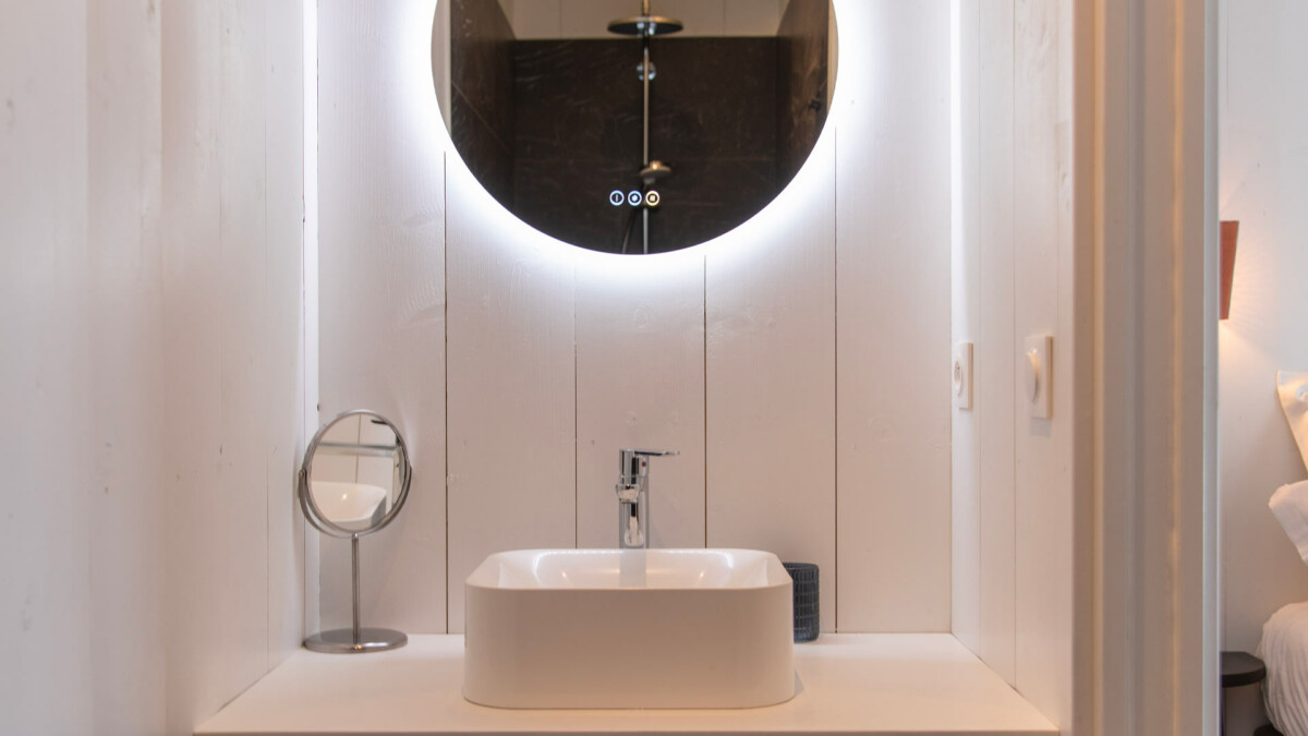 Chambre, Rez-de-chaussée. La chambre propose 1 lit double 140 cm transformable en lits twin. Salle de bain privée, avec douche. WC partagés. La chambre inclut également : climatisation.