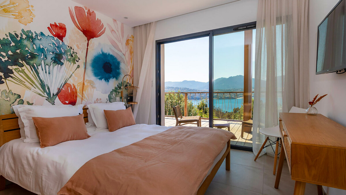 Chambre, 1er étage, accès direct à la terrasse. La chambre propose 1 lit double Queen size. Salle de bain privée, avec 2 vasques, douche. La chambre inclut également : TV, dressing.