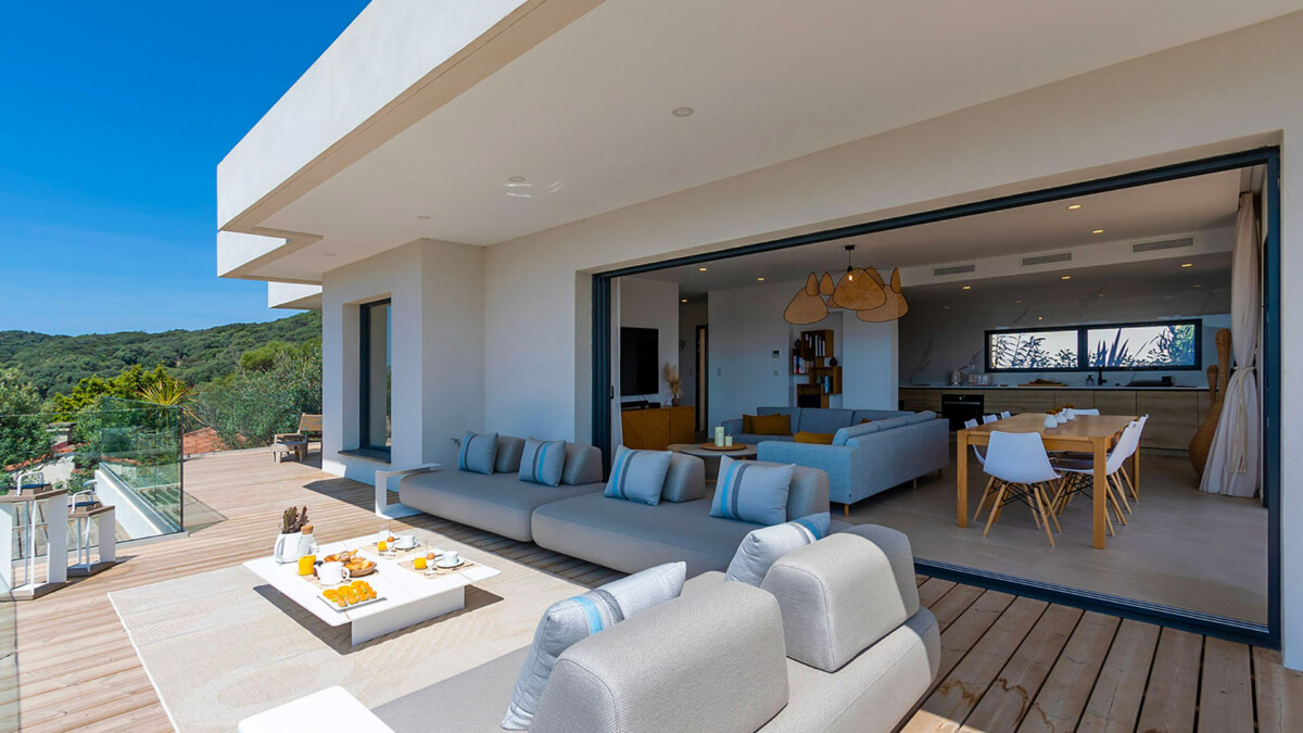 Le salon et la terrasse, qui sont largement ouverts sur la mer, sont confortablement aménagés.