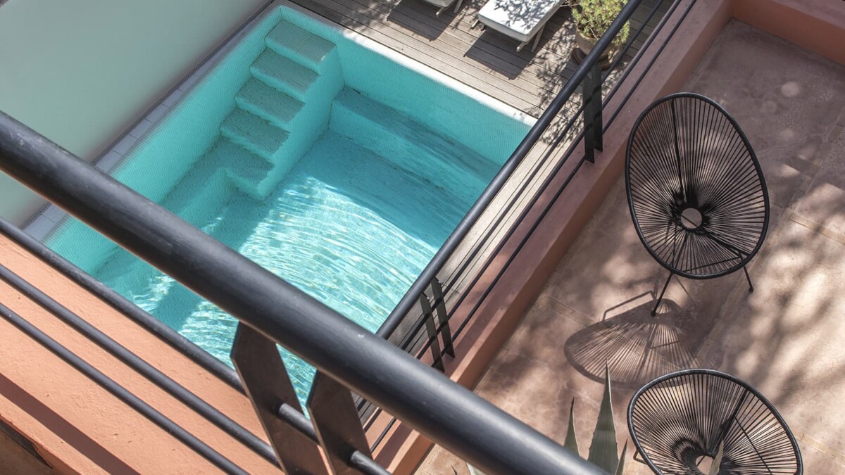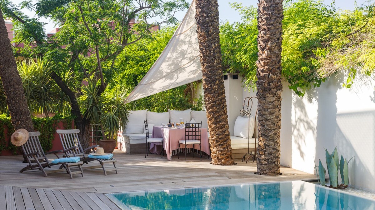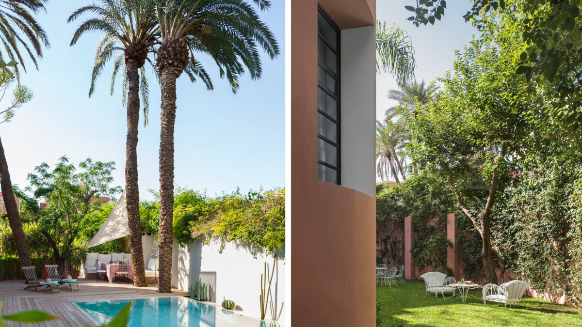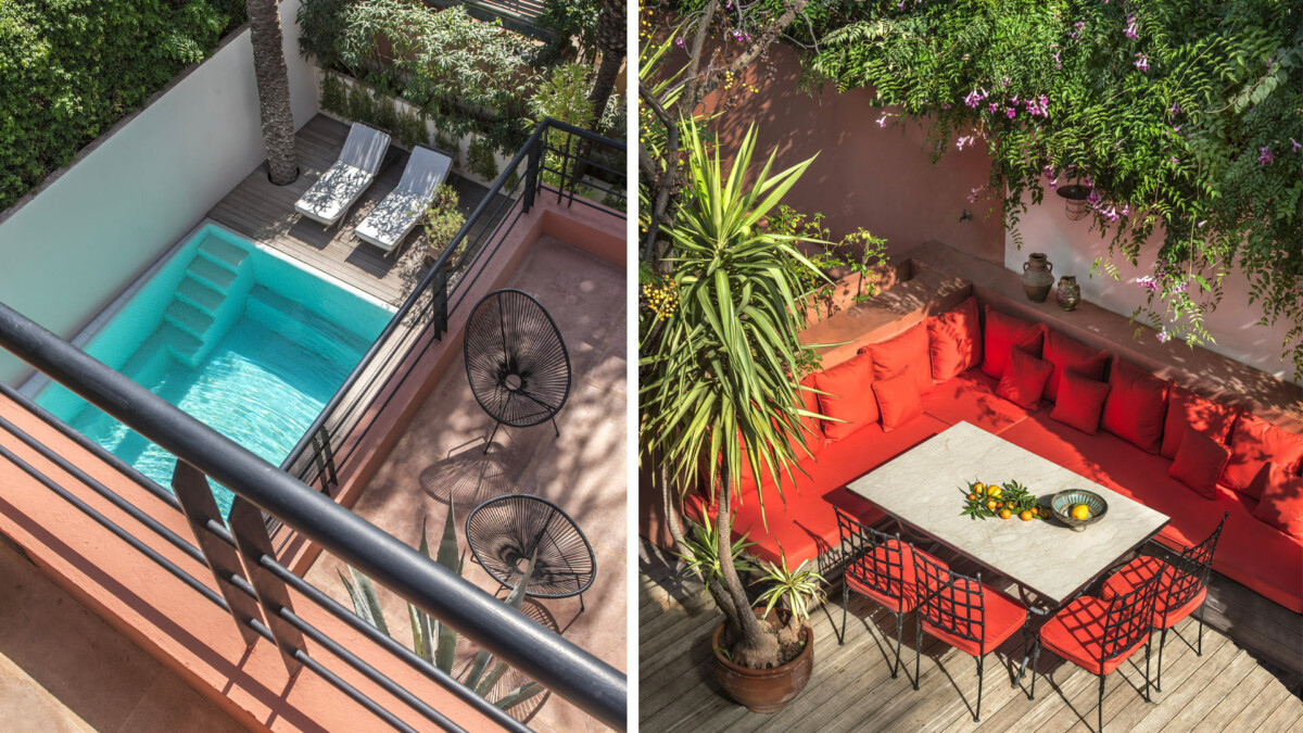 La terrasse panoramique surplombe la végétation luxuriante du quartier Majorelle. Vous pouvez vous reposer dans la piscine (8mx3m) avec les transats tout autour.