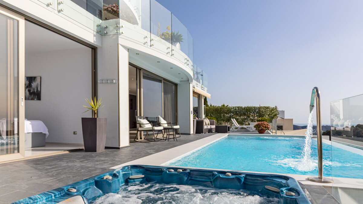 Le salon de la villa est ouvert sur la piscine et le jacuzzi extérieur.