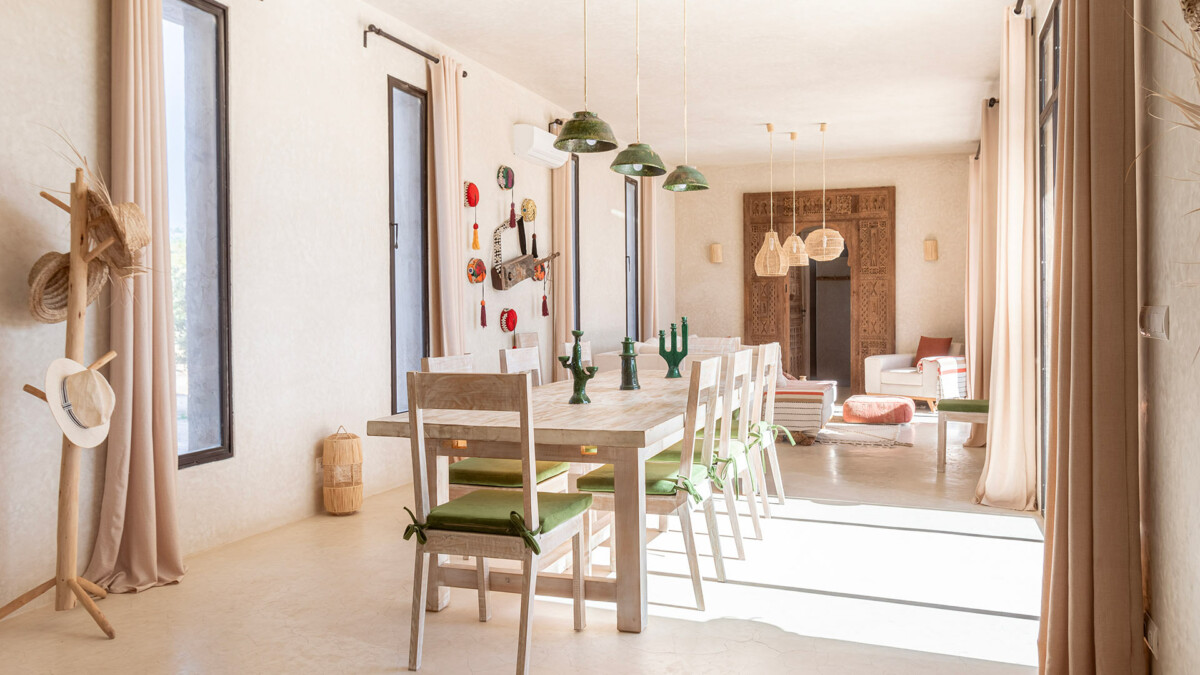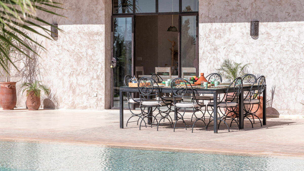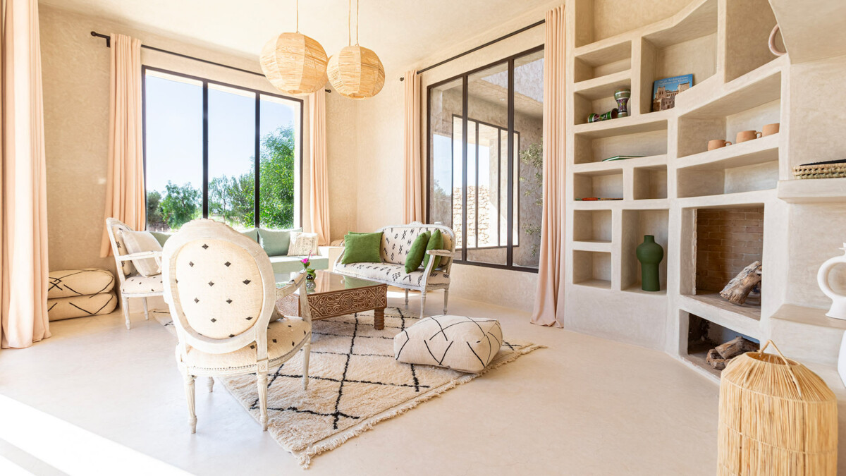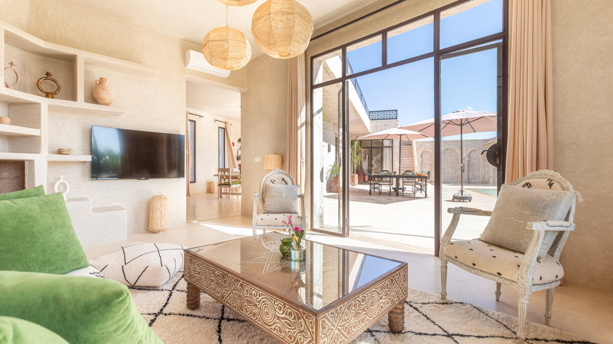 Les intérieurs sont un parfait mélange de modernité et de charme marocain traditionnel. Le salon cosy, avec sa cheminée, offre une double vue imprenable sur un jardin intérieur et la piscine, créant une ambiance apaisante. La salle à manger, s’ouvrant sur les terrasses, est l’endroit parfait pour partager vos repas en toute convivialité. Le séjour, à la décoration faite de pierres sèches et de fer forgé traditionnel, est baigné de lumière naturelle et vous invite à la détente.