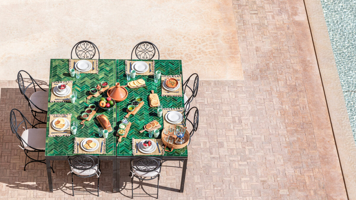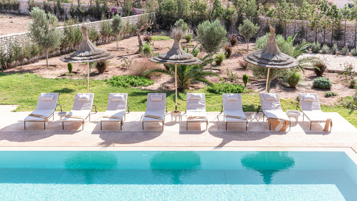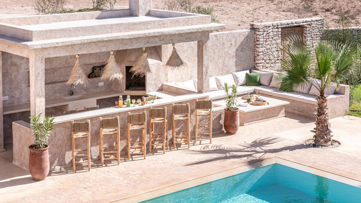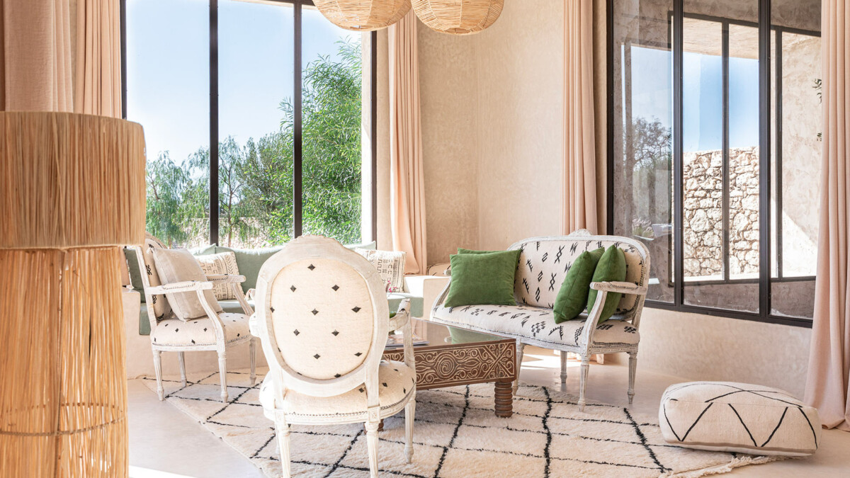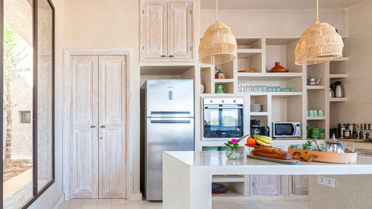 Les intérieurs sont un parfait mélange de modernité et de charme marocain traditionnel. Le salon cosy, avec sa cheminée, offre une double vue imprenable sur un jardin intérieur et la piscine, créant une ambiance apaisante. La salle à manger, s’ouvrant sur les terrasses, est l’endroit parfait pour partager vos repas en toute convivialité. Le séjour, à la décoration faite de pierres sèches et de fer forgé traditionnel, est baigné de lumière naturelle et vous invite à la détente.