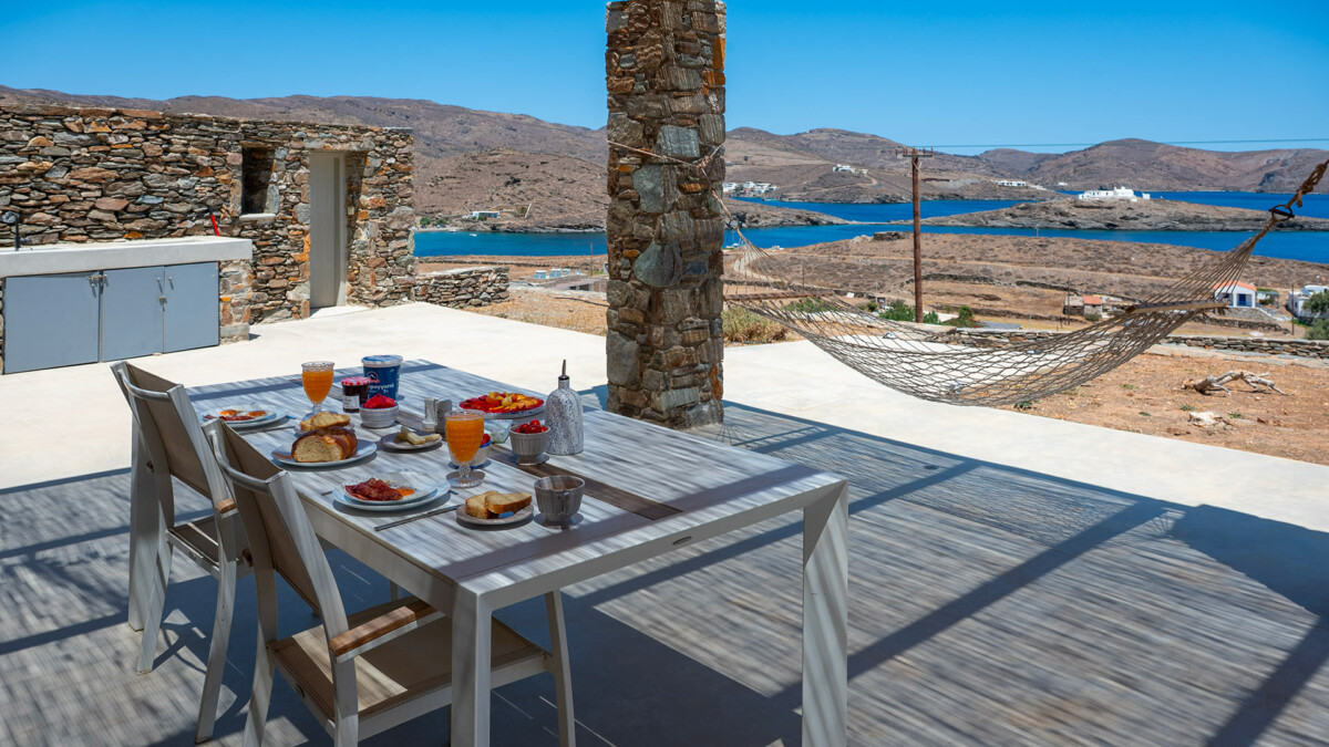 La villa se distingue par ses intérieurs élégants et ouverts, où la décoration cycladique traditionnelle rencontre le confort moderne. Le salon et la salle à manger sont conçus pour accueillir jusqu’à huit personnes, avec une cuisine entièrement équipée pour préparer vos repas avec facilité. Les espaces de vie sont baignés de lumière naturelle grâce à de grandes fenêtres qui donnent sur la terrasse. La décoration simple mais raffinée incorpore des éléments naturels et des nuances apaisantes, créant une ambiance chaleureuse et accueillante.