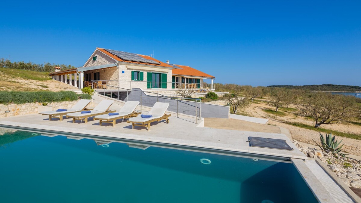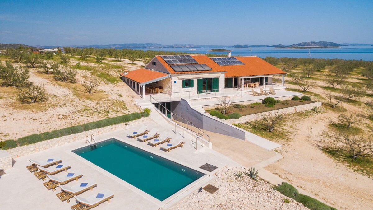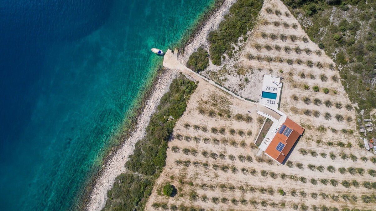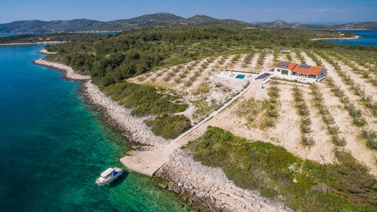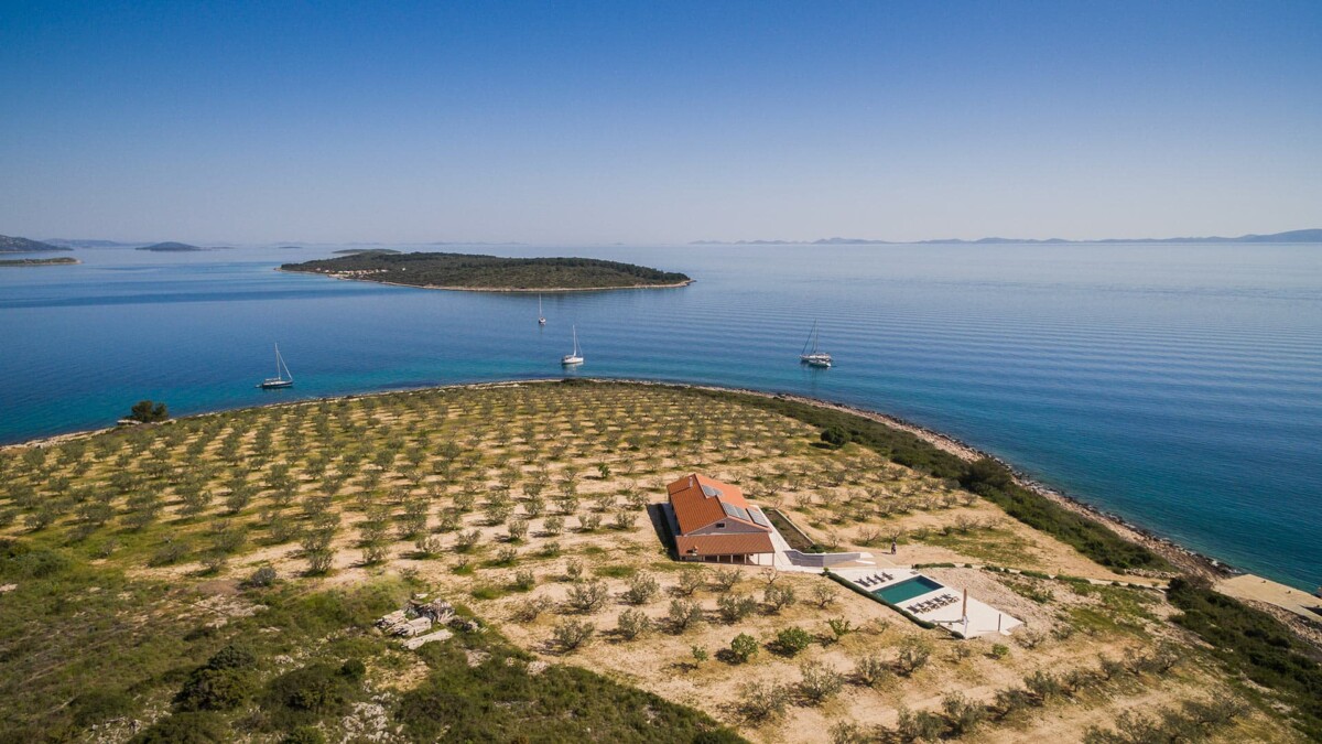 La maison est construite sur une oliveraie privée de 47.500 m2, sur une île.