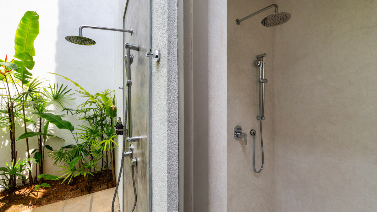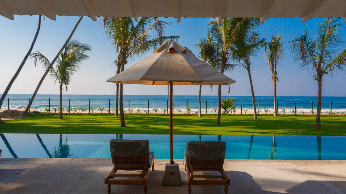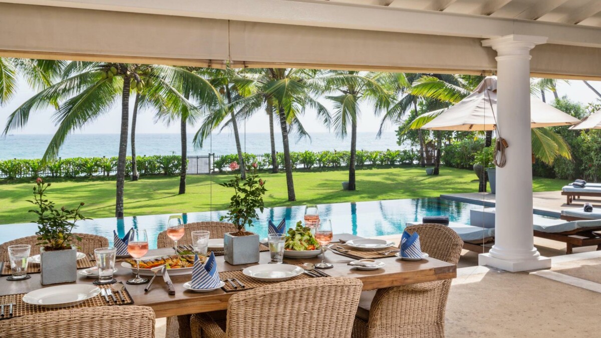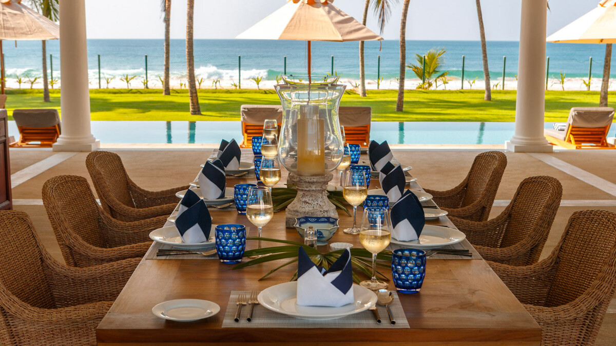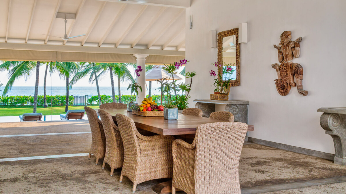La villa s’articule autour de confortables espaces extérieurs communs. La salle à manger en plein air bénéficie d’une vue magnifique sur l’océan.