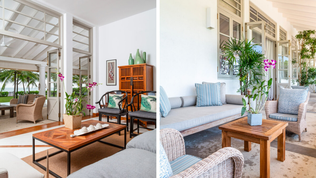 Les grands salons confortables et climatisés sont décorés avec des meubles chinois antiques importés de Hong Kong et s’ouvrent sur des vérandas couvertes donnant sur la piscine.