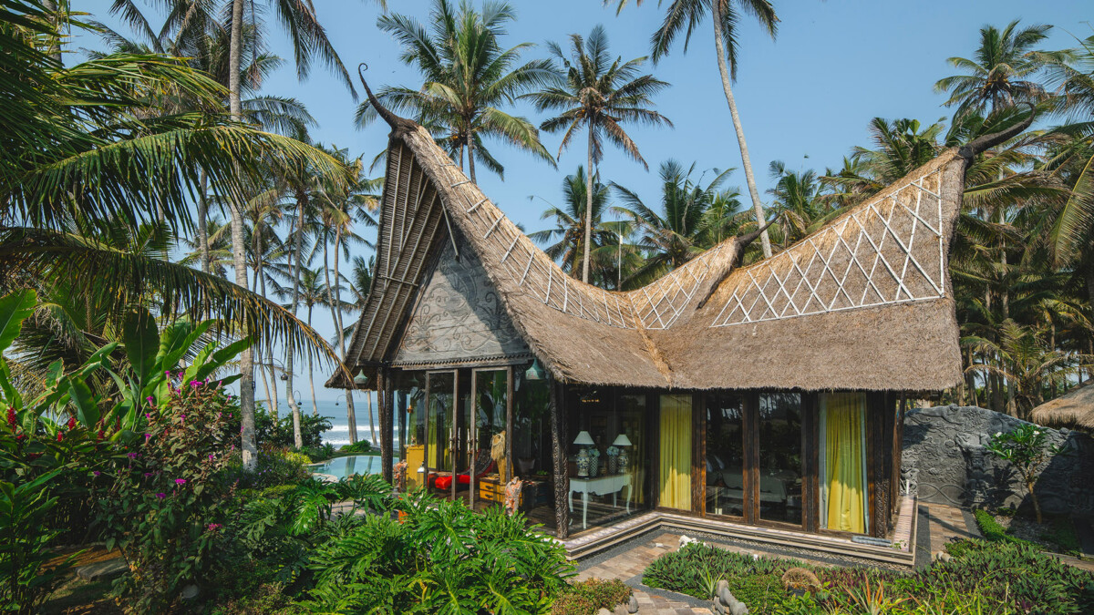 Fabuleuse villa située au bord de l’océan dans une petite palmeraie. L’atmosphère de cet endroit est extrêmement romantique – plages isolées, sable noir scintillant, terrasses de riz émeraude sous le ciel étoilé. Construite à partir de bois de fer avec d’énormes fenêtres panoramiques sur le sol qui offrent une vue imprenable. Bungalow d’architecture – le jeu éclectique de Sumatra abrite Menang Kabo et le charme colonial, avec leur toit étonnant, ouvert vers le haut comme les ailes d’un oiseau magique.