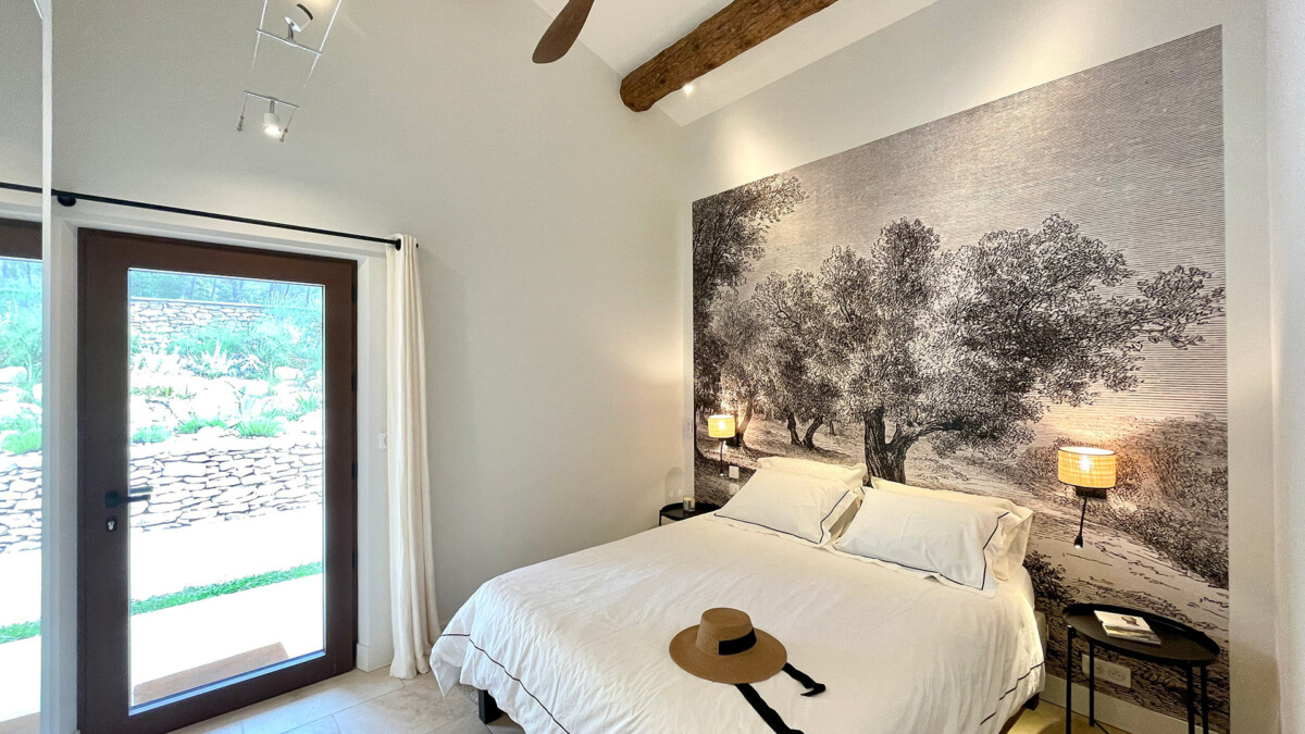 Chambre de maître, Rez-de-chaussée. La chambre propose 1 lit double 180 cm. Salle de bain privée, avec baignoire, douche. WC séparés. La chambre inclut également : climatisation, dressing, terrasse privée, ventilateur.
