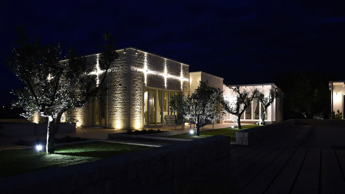 La villa dispose de deux piscines : un premier bassin et une piscine à débordement. Les hôtes peuvent profiter d’un salon et d’une cuisine en plein air qui peut être entièrement ouverte ou fermée, selon la météo. Un four à pizza traditionnel à feu de bois est également à disposition. Le tout est immergé dans 10 000 mètres carrés d’oliveraies.