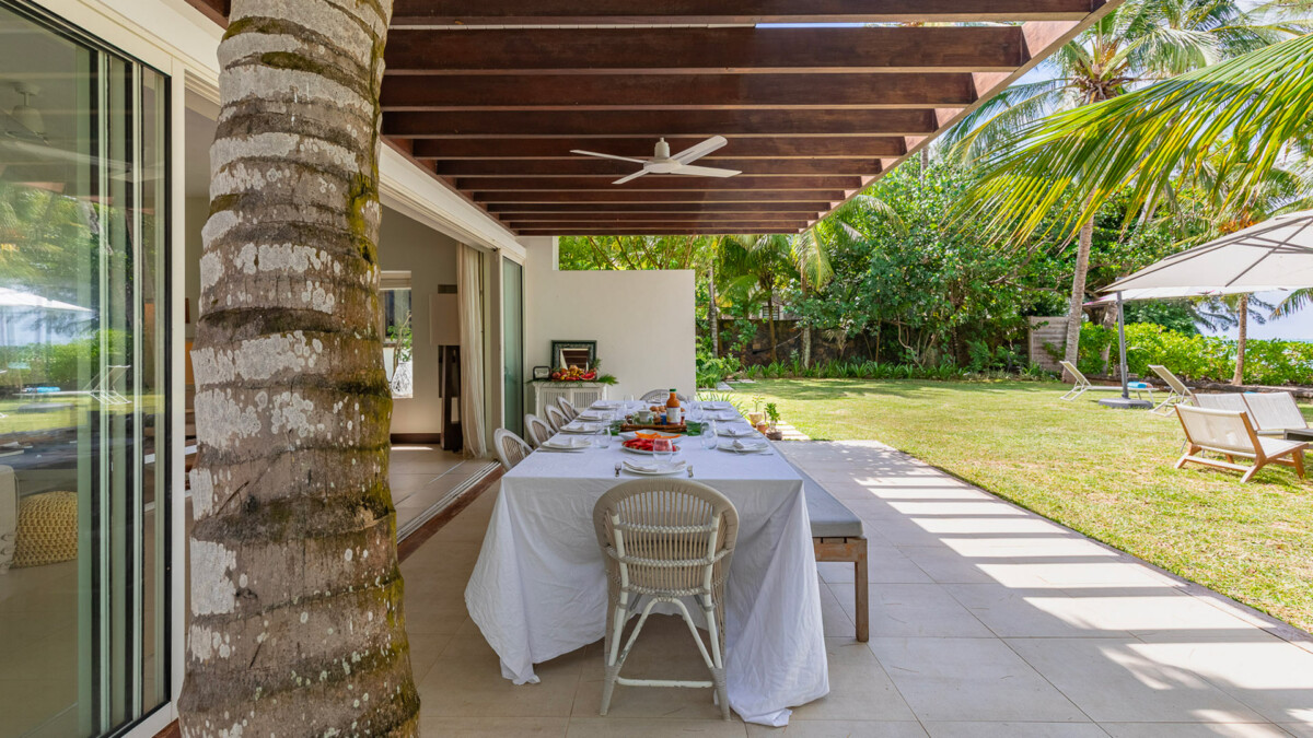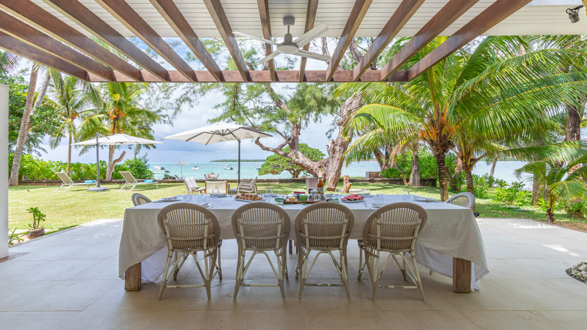 De confortables chaises longues sont installées face à l’océan et la terrasse de la maison, qui donne sur le jardin enchanteur, comporte un très agréable espace de repas.