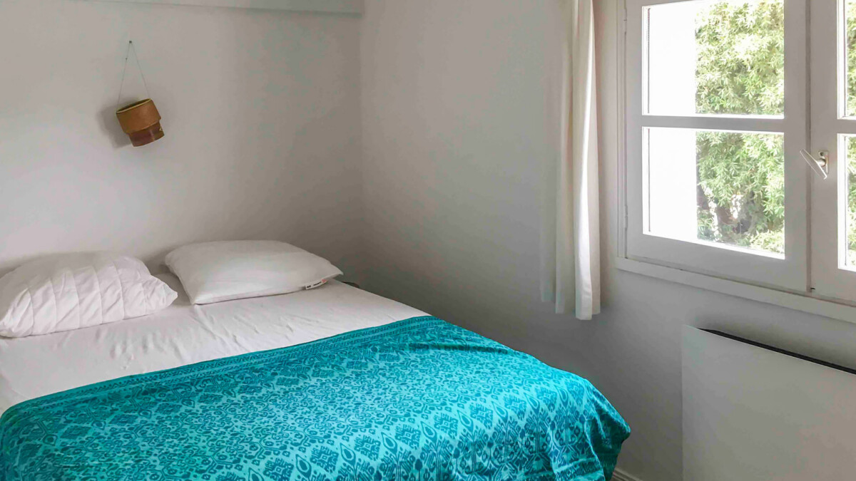 Chambre, 1er étage. La chambre propose 2 Lits dont 1 lit simple 90 cm, 1 lit double 140 cm. Salle de bain partagée, avec douche.