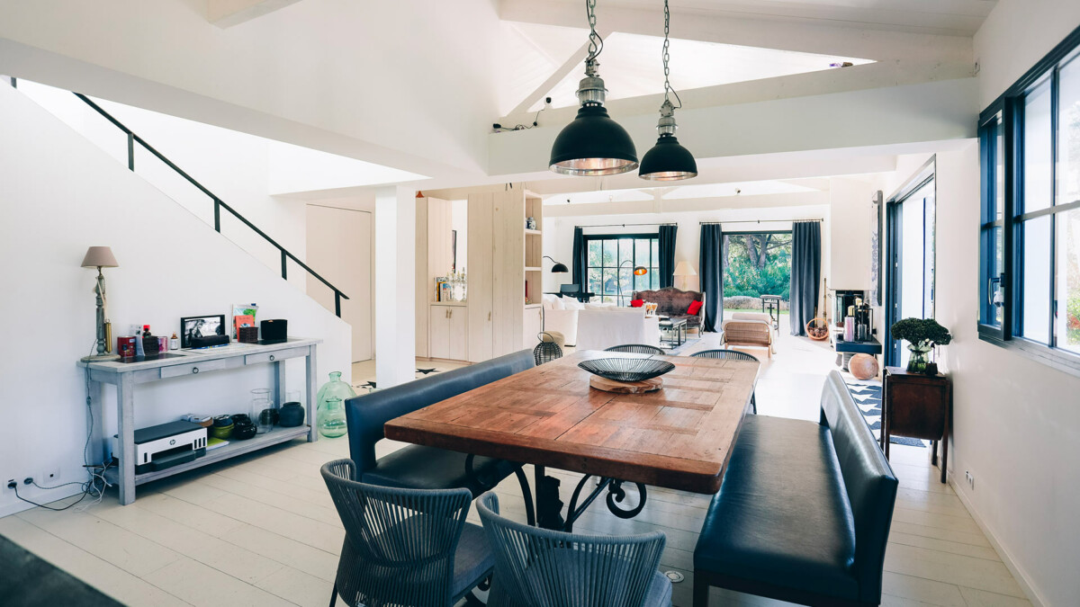 Elle est luxueuse et comprend un salon TV au premier étage et au rez-de-chaussée une très grande pièce à vivre avec cheminée, une cuisine entièrement équipée avec son arrière cuisine/ buanderie (seche linge – lave linge) et son espace « repas ». La pièce de vie s’ouvre sur l’extérieur et les terrasses en bois et apporte une grande clarté au lieu.