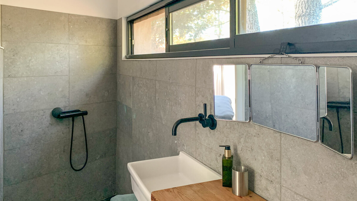 Le cabanon comporte quant à lui une chambre double avec salle de douche à l’italienne et WC indépendant et douche extérieure.