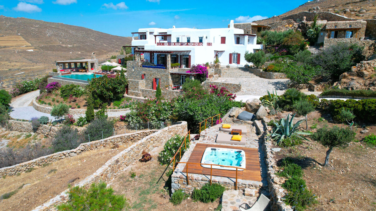 Idéalement située à 300 mètres à pieds de la superbe plage de Lia cette prestigieuse propriété offre un panorama exceptionnel à 180° sur la mer, les îles de Naxos et de Paros, le cap Tarsanas et la magnifique plage. Construite au cœur d’une zone protégée, au centre d’un jardin méditerranéen, cette spacieuse villa de 800m2 exposée plein sud et à l’abris du vent n’a aucun vis a vis ni voisin proche. La villa bénéficie d’une décoration rafinée combinant antiquités, meubles anciens et contemporains avec des éléments architecturaux traditionnels grecs. Toutes les pièces principales et les chambres profitent d’une superbe vue sur la mer.