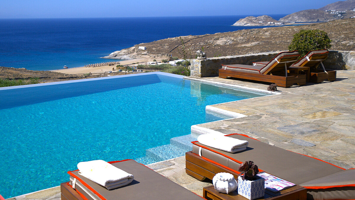 La piscine à débordement de 15 m x 6 m, est bordée par un espace lounge ombragé avec un bar, un système de sonorisation et un grand solarium avec de nombreux transats pour profiter de la vue panoramique.